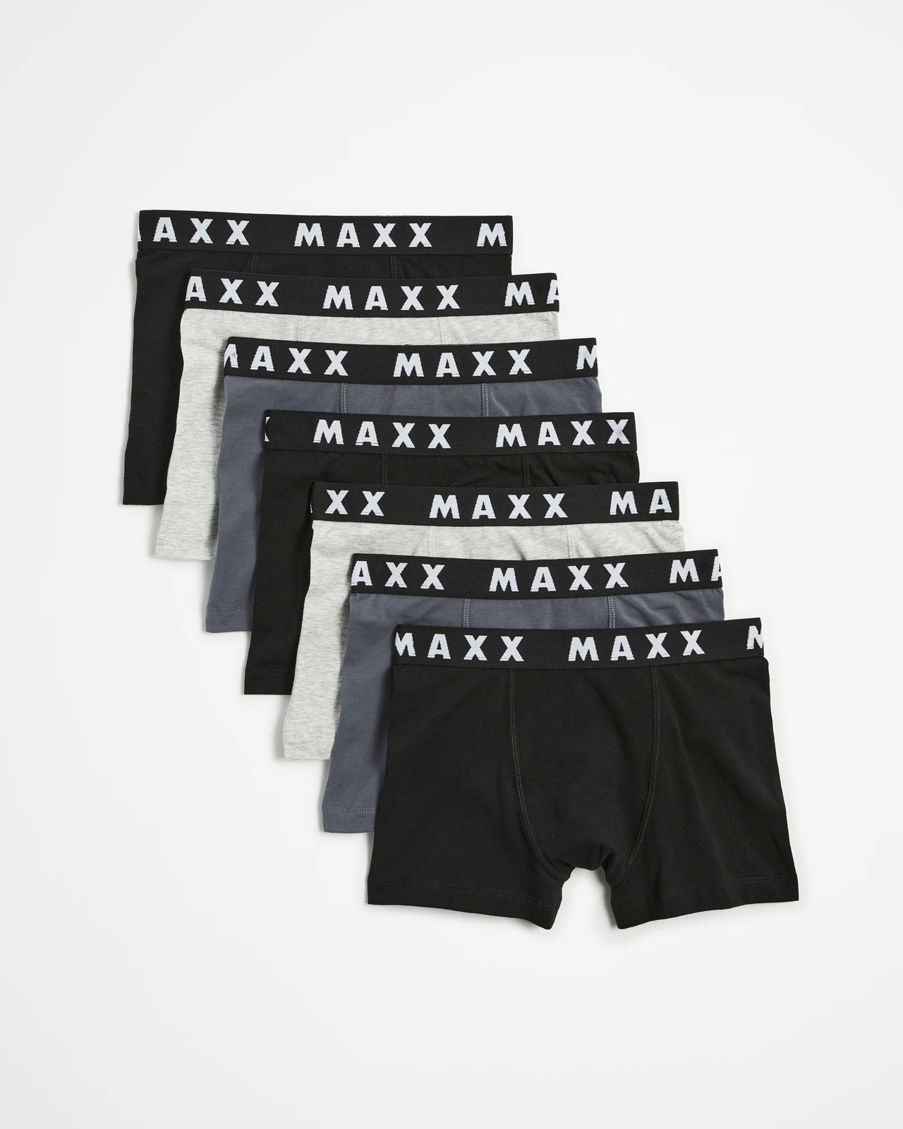 Treat your boy to comfort with our Boys Trunks 7 Pack. Made from cotton with just the right amount of stretch, these trunks provide the perfect fit for every day. The soft touch Maxx elastic waistband ensures gentle support and the black and grey colourways deliver classic style. With seven pairs in each pack, they will have a fresh pair ready for the whole week. Upgrade their underwear drawer today and experience the comfort and fit these trunks offer.