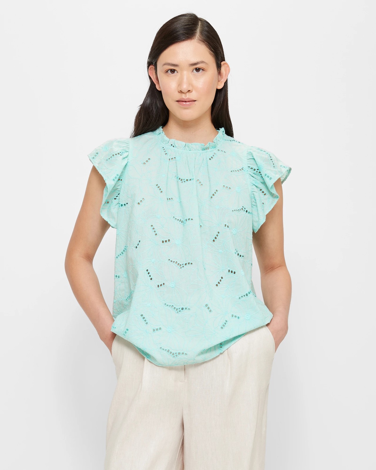 Introducing our stunning Broderie Blouse! Made from high-quality cotton, this blouse features an exquisite all-over broderie floral print, adding a feminine touch to any outfit. With its relaxed fit and beautiful colours, this blouse offers both style and comfort. The round neckline is elegantly adorned with an upper frill, while the gathering under the centre of the neck adds a unique detail. The sleeveless design is enhanced by ruffles around the armholes, giving it a playful and chic look. The curved hemline adds a modern touch, while the back top button closure with a keyhole adds a touch of elegance. The back yoke panel across the shoulders ensures a perfect fit. Available in various sizes, this Broderie Blouse is a must-have addition to your wardrobe. Shop now and add a touch of timeless elegance to your style!
