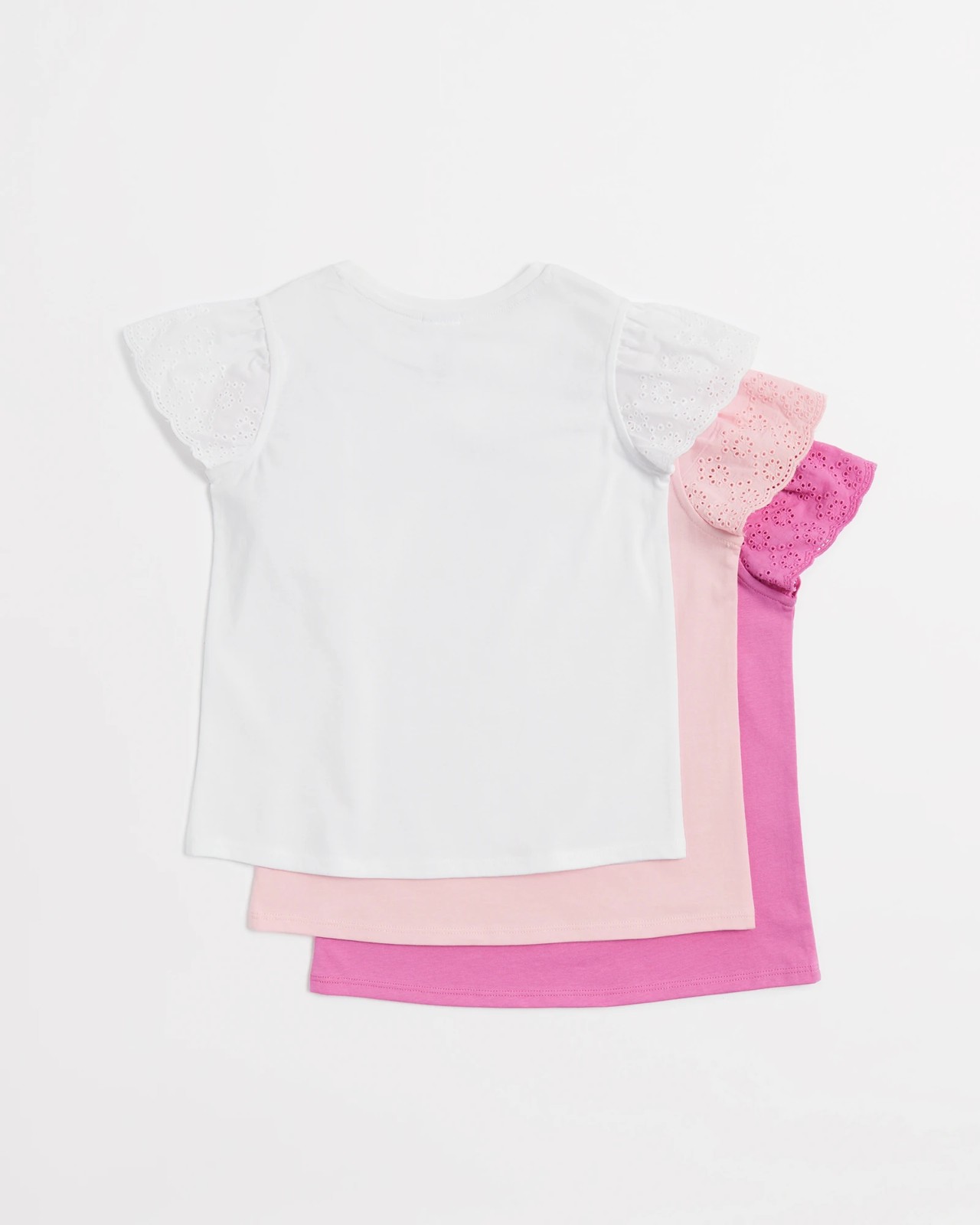 Indulge your little one in the charm of our Broderie Frill T-shirt pack. Perfect for adding a touch of elegance to everyday outfits, these t-shirts feature delicate broderie frill short sleeves and a comfortable crew neck design. Crafted from soft cotton, they offer a regular fit and a stylish straight hem. Elevate your child's wardrobe with three beautiful options in one pack! Make them feel special in these chic and versatile t-shirts that are sure to become instant favourites.
