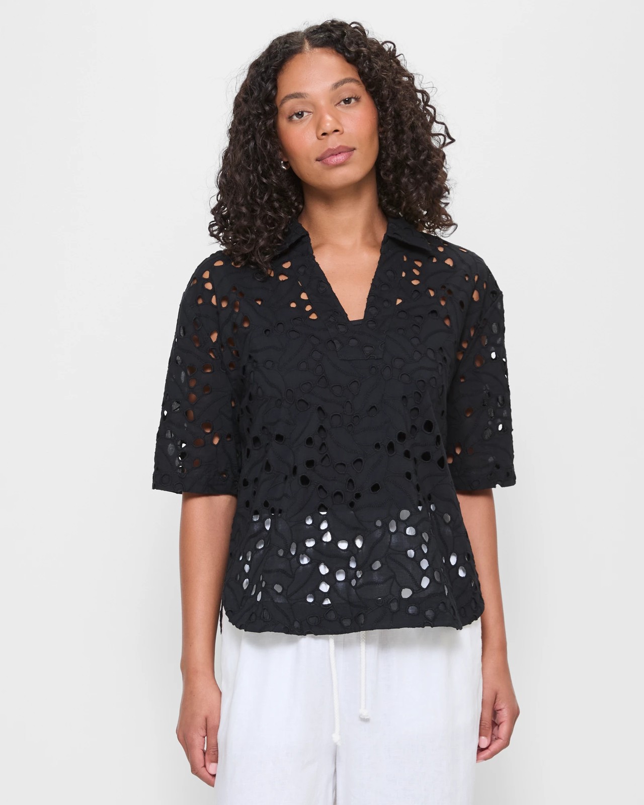 Discover the charm of our Broderie Polo Pullover Top, designed to offer a perfect balance of comfort and style. Made from cotton, this breathable polo top ensures you stay cool and at ease throughout the day. With its regular fit and exquisite broderie cut outs, it adds a touch of sophistication to any outfit. The top features a round collared neckline with a tasteful v-drop front, short sleeves, and a curved high-low hemline. Make this lovely piece your go-to choice for various occasions.