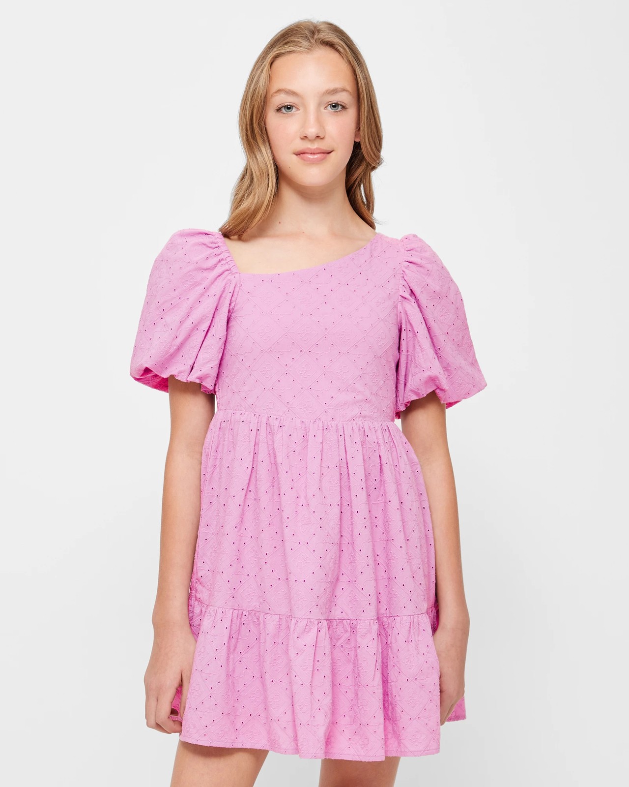 Introducing our Broderie Puff Sleeve Dress, a delightful addition to your little girl's wardrobe. Made from soft and breathable cotton, this dress offers a regular fit that ensures all-day comfort. The vibrant pink colour adds a cheerful touch to any occasion. Featuring an asymmetrical neckline with elastic, it offers a stylish look. The short balloon sleeves with elastic cuffs and the gathered elastic waistband add playful details to the dress. With its tiered hem and shirred elastic back bodice, this dress offers a charming and feminine silhouette. It is lined for added comfort and comes in a midi length. Make your little girl feel special and stylish with this lovely dress!