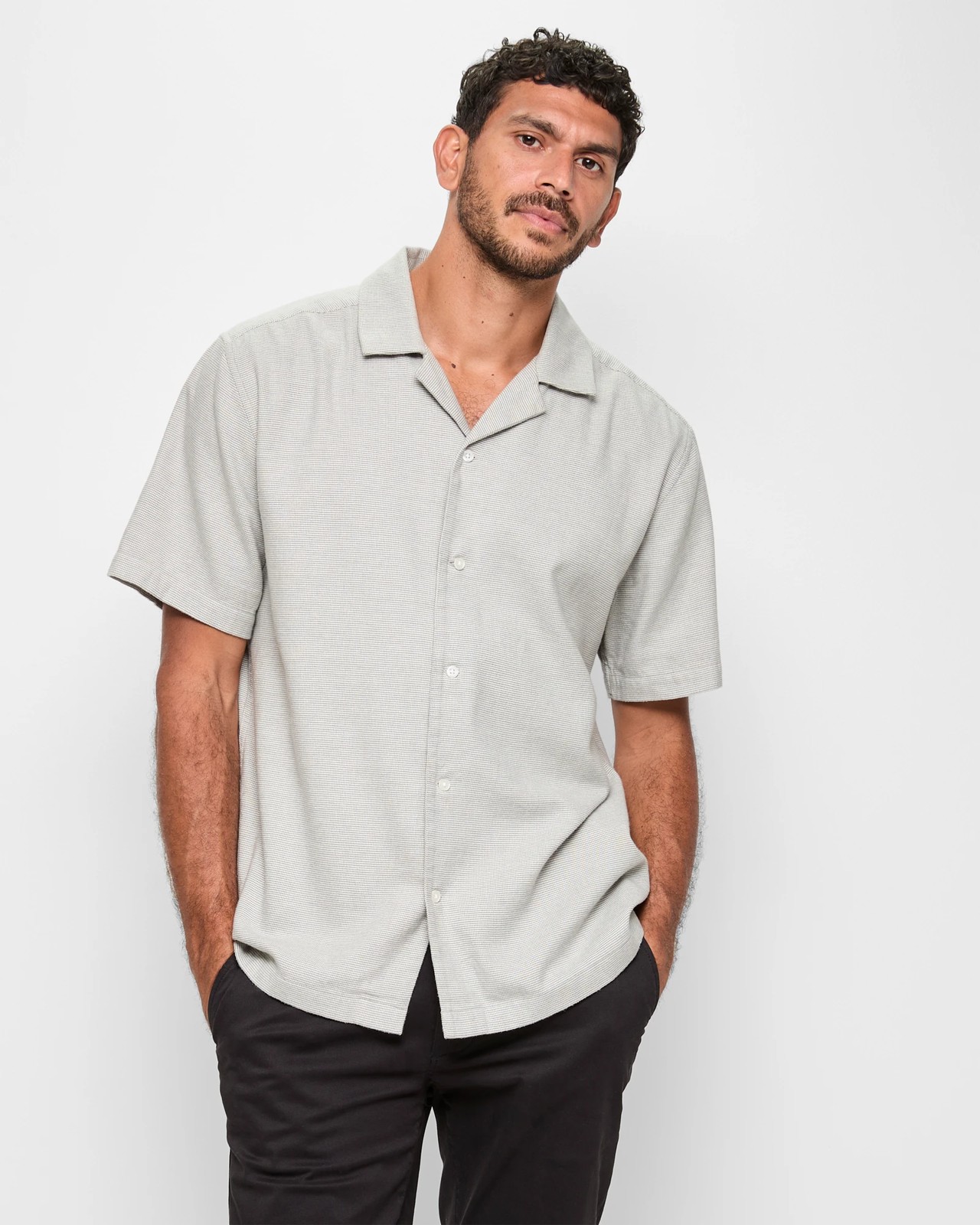 Introducing our Brushed Revere Shirt for men. Made from a soft cotton fabric, this shirt features an all-over brushed pattern that is sure to catch the eye. It is designed to keep you comfortable, while the regular fit and round collared neckline with small front lapels add a touch of class. The button-through front and short sleeves make it perfect for any occasion. The straight hemline and back centre pleat offer ease of movement, ensuring you stay relaxed throughout the day. Add this versatile piece to your wardrobe now!