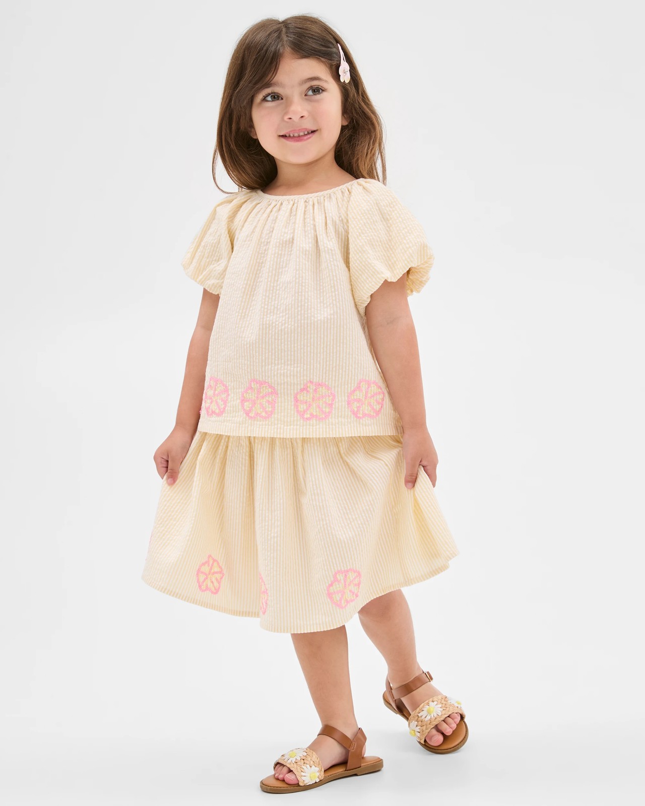Bring a cheerful touch to your child's wardrobe with the Bubble Hem Woven Top, designed for both comfort and style. Made from soft cotton, this delightful top stands out with its textured seersucker finish and lively striped pattern, making it suitable for everyday wear or special occasions. Short puff sleeves and elegant embroidery along the front hem create a look that's both charming and unique. The convenient back button with keyhole ensures quick and easy changes, so your little one is always ready for any moment. With its regular fit, this top offers lasting comfort all day long. Pair it seamlessly with matching pieces or wear it solo for a sweet, put-together ensemble. Let your little one shine and feel confident—choose the Bubble Hem Woven Top today.