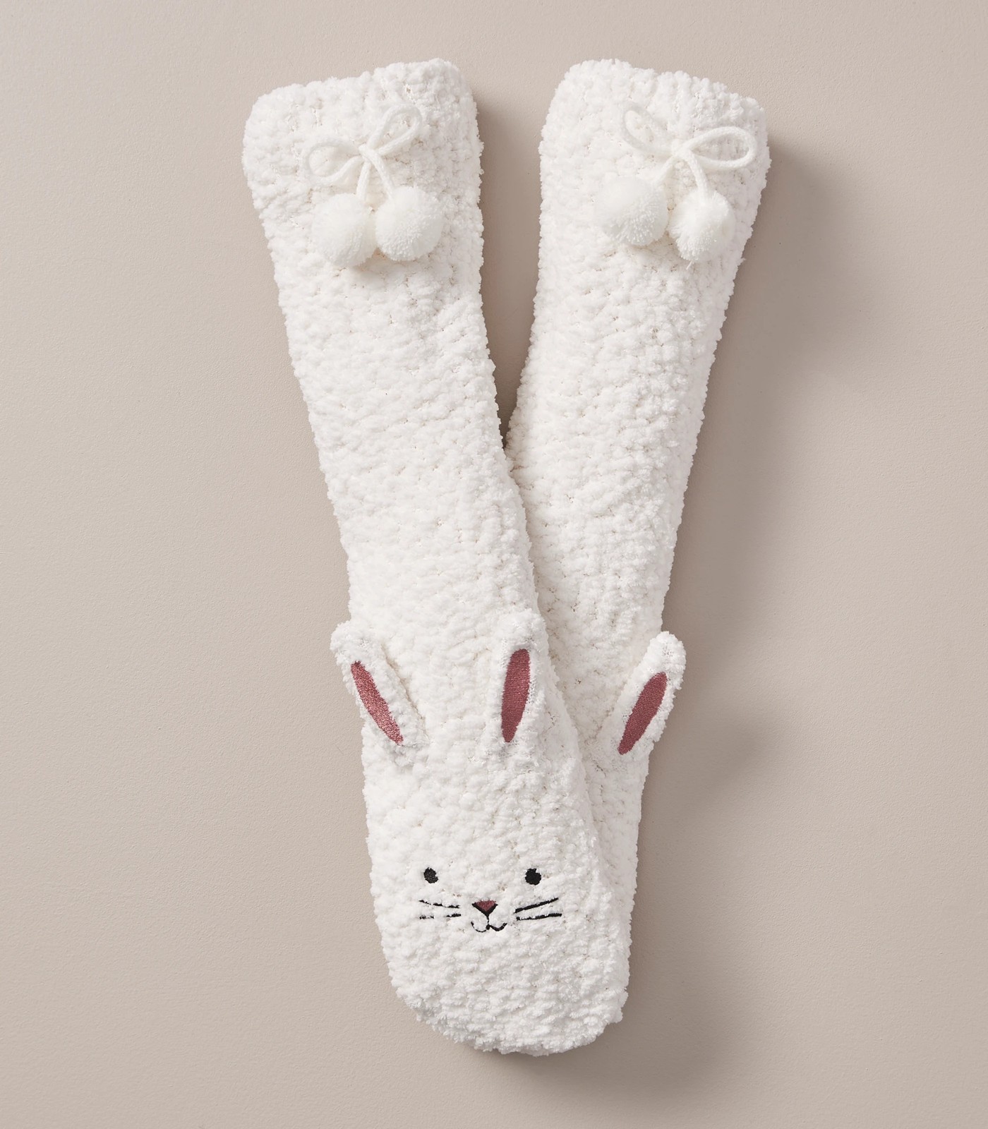 The bunny home socks are great for wear around the house. They have a soft, fluffy outer and lining for warmth, with a bunny face and ears on the top of the foot, pop poms on the front opening and silicone grips on the soles.