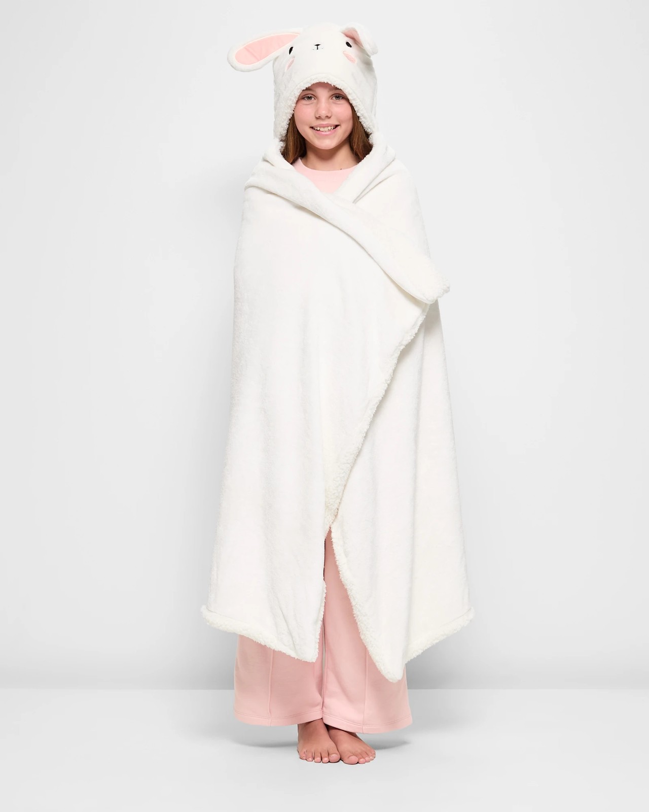 Cocoon your little one in the delightful Bunny Kids Hooded Throw, made from cosy velvet polyester for an incredibly soft feel. This charming white throw showcases a bunny hood with embroidered features and playful 3D ears, making it both adorable and fun. With its Sherpa lining, it offers exceptional warmth, ensuring your child stays snug during chilly days and nights. Easy to maintain, it's machine washable for your convenience. Measuring 150cm wide and 110cm long plus 16cm ears, this hooded throw perfectly combines joy with practicality. Provide your child with unrivalled comfort and a touch of whimsy today!