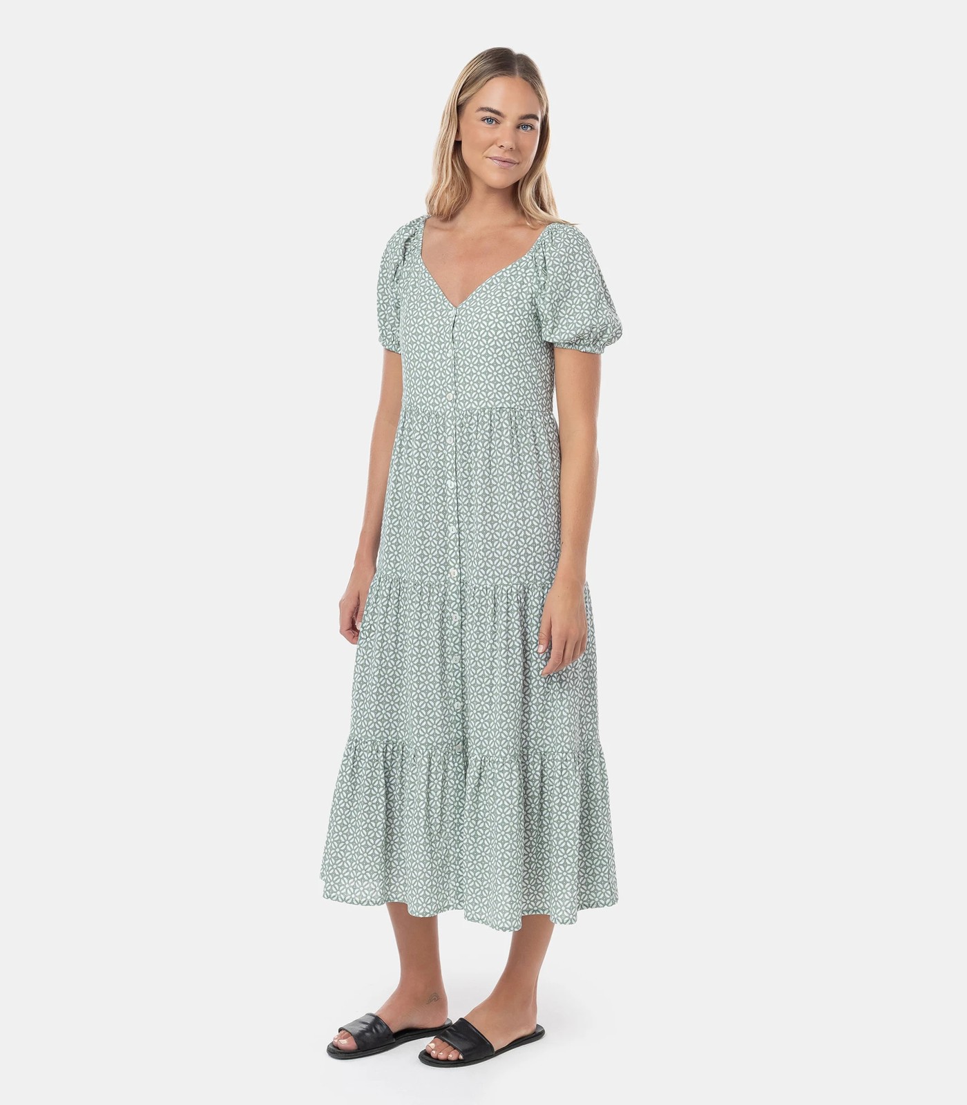 Discover the perfect blend of style and comfort with this Piping Hot dress. The puff sleeve detail, flattering v-neckline, button up front and tiered skirt makes this dress perfect for any occasion.