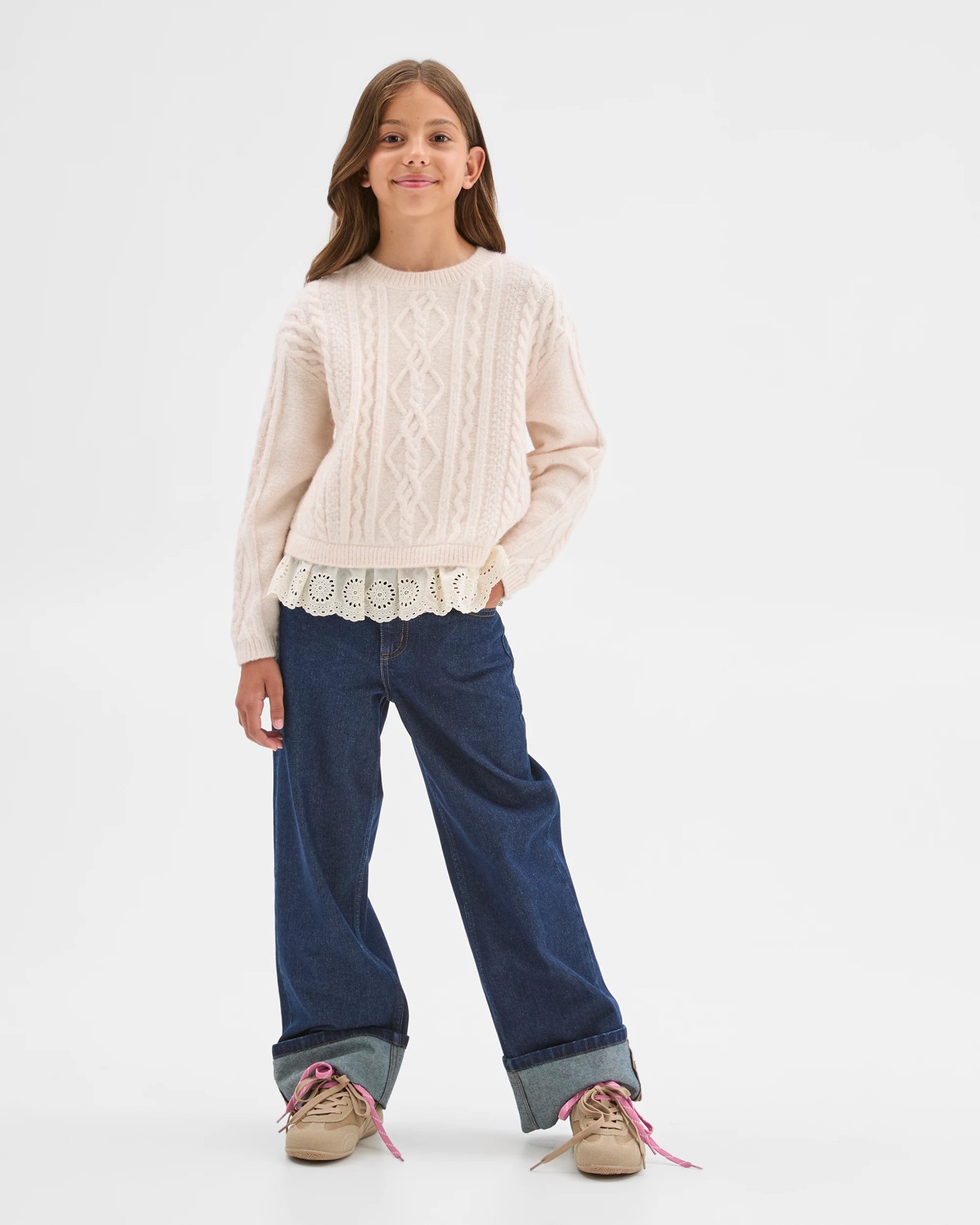 Let your child enjoy cosiness and style with the Cable Knit Lace Hem Sweater. Boasting a beautiful cable knit pattern across the front and sleeves, this sweater is designed for both comfort and flair. The regular fit and ribbed crew neckline make it easy to wear throughout the day, while long sleeves with ribbed edges keep her nice and snug. A delicate woven lace frill at the straight ribbed hemline adds a playful and charming touch she’s sure to love. Perfect for adding an extra touch of sweetness to any outfit—treat her to this lovely sweater and make everyday dressing extra special.