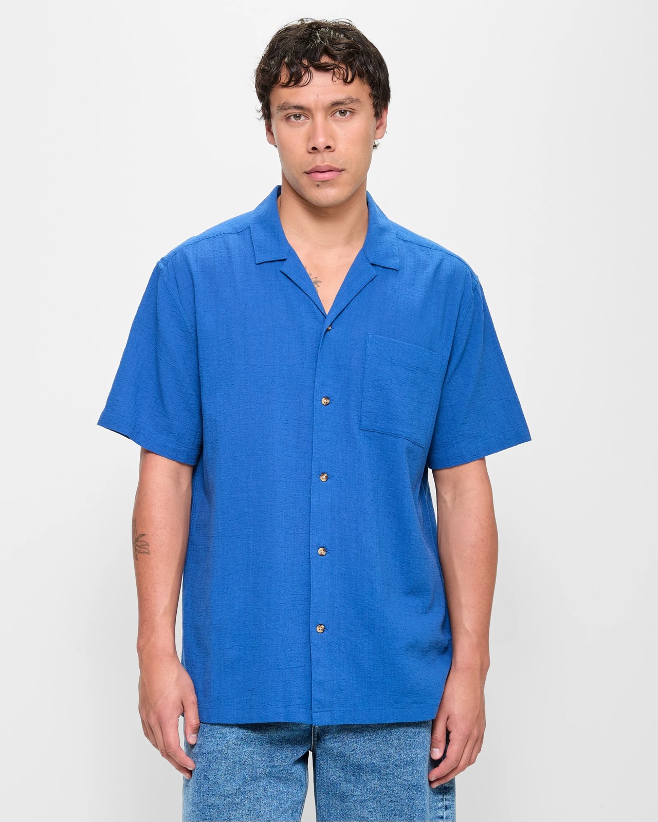 Experience comfort and style with the Commons Camp Collar Shirt. Crafted from a lightweight cotton blend, the shirt features a textured design that adds a touch of sophistication to your outfit. The camp collared neckline and button-through front create a casual yet chic look, perfect for any occasion. With its regular fit and airy construction, you'll stay cool and relaxed all day long. Elevate your wardrobe with the Commons Camp Collar Shirt today!