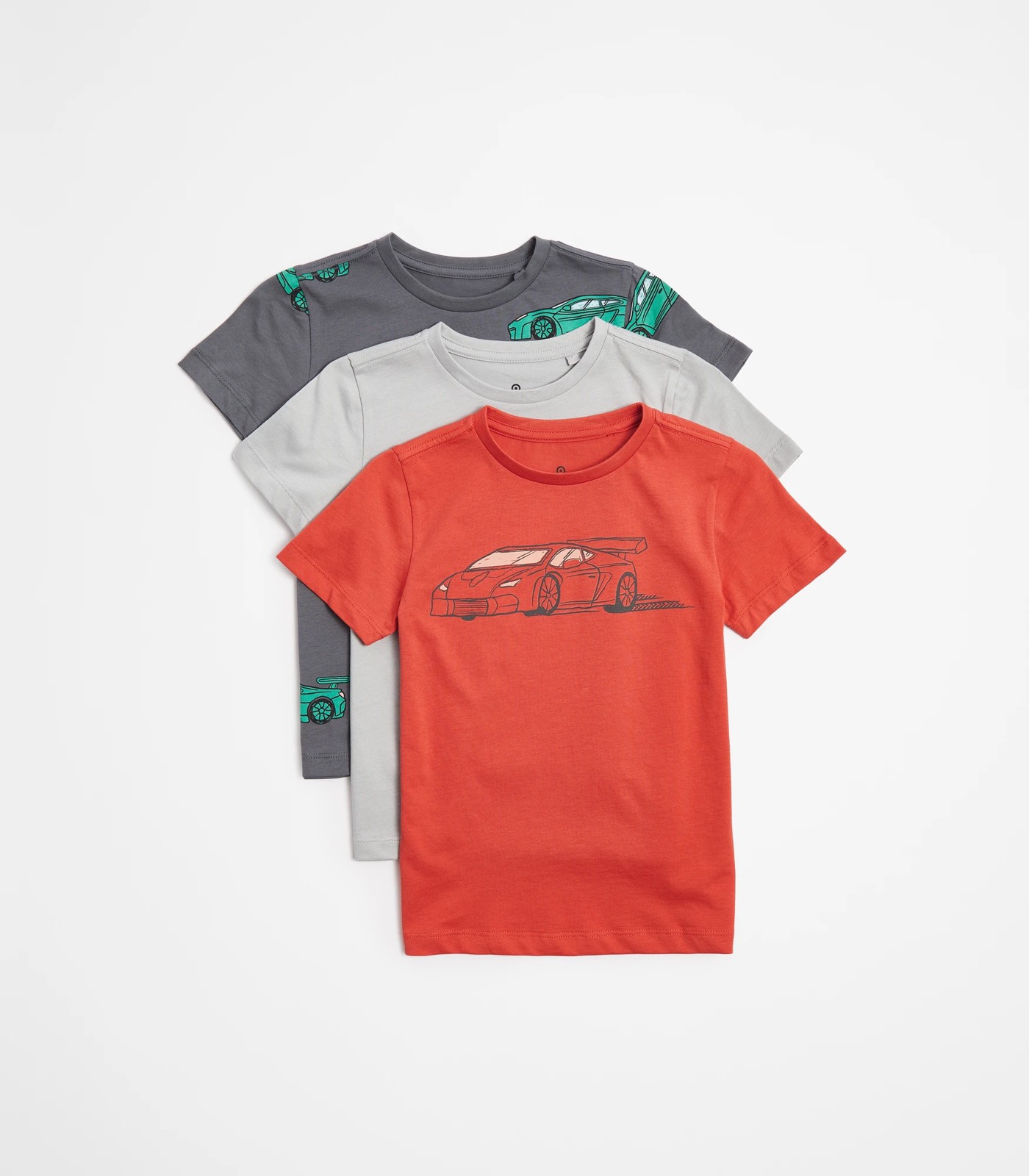Introducing our Car Print 3 Pack T-shirts for boys. Made with a soft and comfortable cotton fabric, these t-shirts ensure a regular fit for all-day comfort. Each pack includes three t-shirts featuring a variety of cool car prints and colours, perfect for adding a touch of fun to any outfit. The ribbed crew neck and short sleeves offer a classic look, while the high-quality construction guarantees durability. Whether it's a playdate or a family outing, these t-shirts are a must-have addition to any little boy's wardrobe. Shop now and enjoy the style and comfort of our Car Print 3 Pack T-shirts!