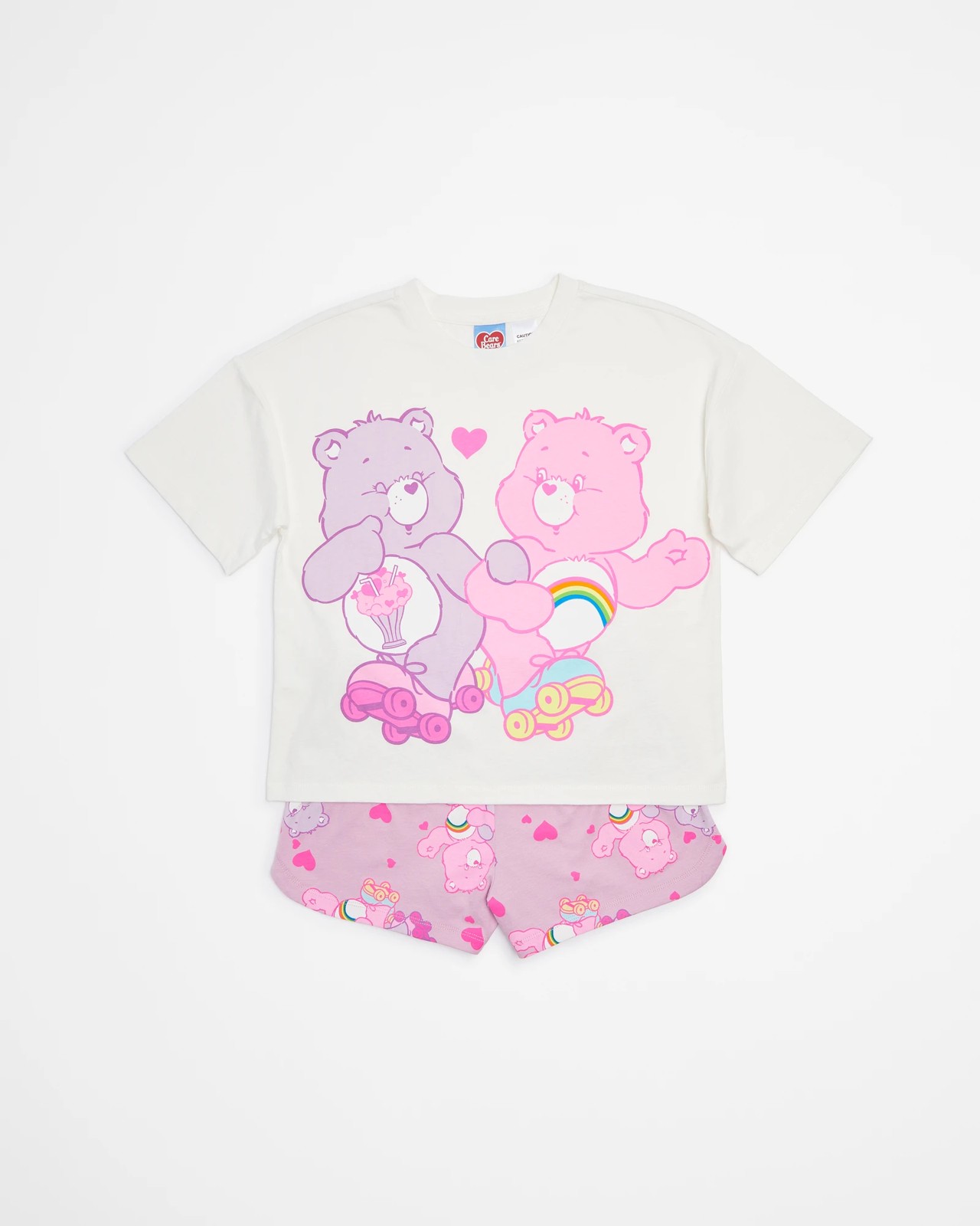 This adorable two-piece pyjama set is made with a Cotton and offers regular fit. The top features a ribbed crew neck, short sleeves and a large Care Bears print to the front. The matching shorts showcase an all over print in pink and have an elasticated waistband for extra comfort. Perfect for snuggling up on those chilled nights, this pyjama set is sure to bring a smile to any face.
