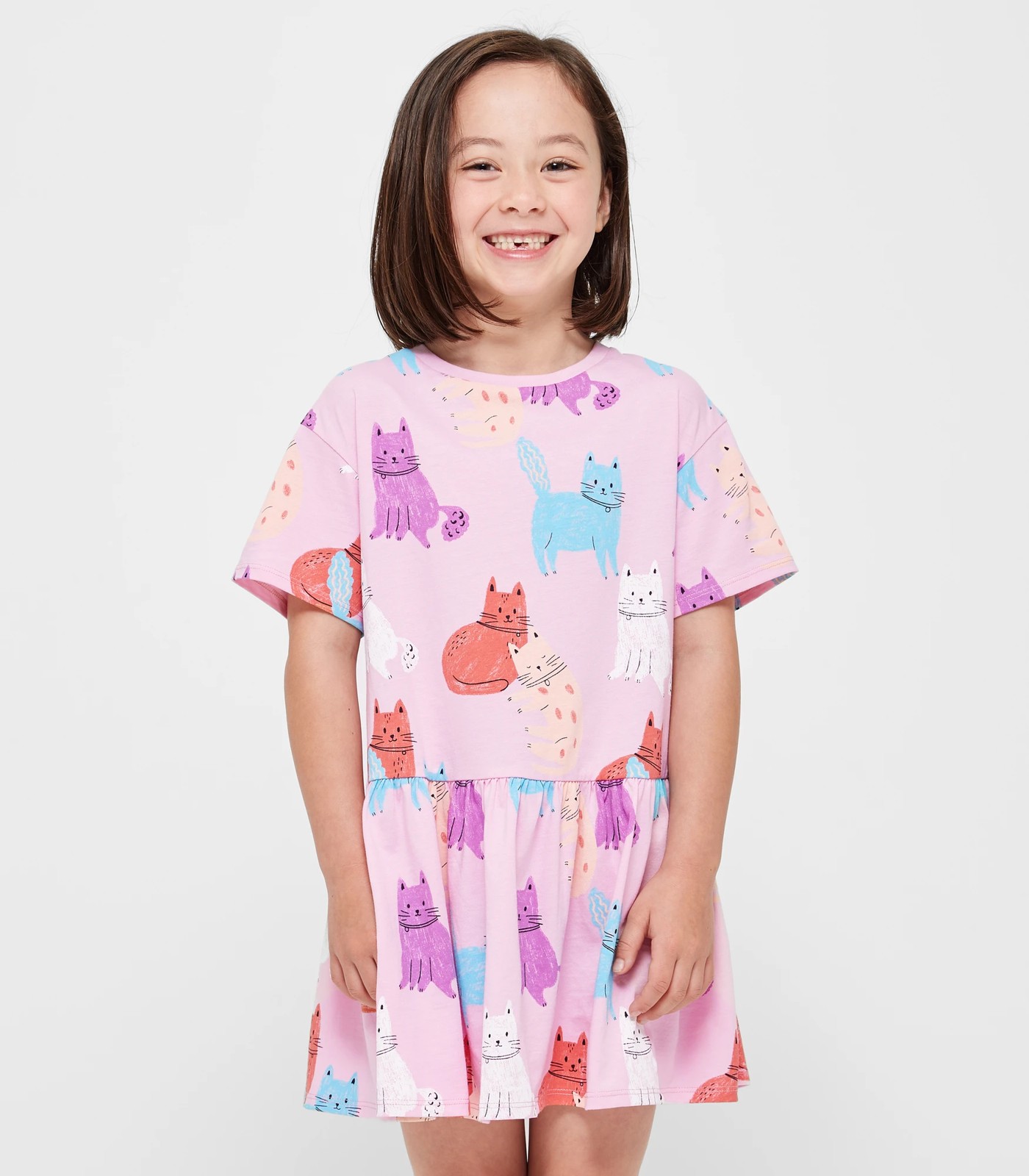 Introducing our delightful Cat Print Dress for girls. Made from high-quality cotton fabric, this dress offers a comfortable and regular fit. The pretty pink dress is adorned with an adorable all-over cat print, adding a playful touch to your little one's wardrobe. Featuring a crew neck and short sleeves, it is designed for easy wearing and movement. The gathered elastic drop waist adds a stylish flair to the dress. Whether it's a casual day out or a special occasion, this dress will make your little girl look irresistibly cute. Treat your child to this charming dress and watch them twirl with joy. Get yours now!