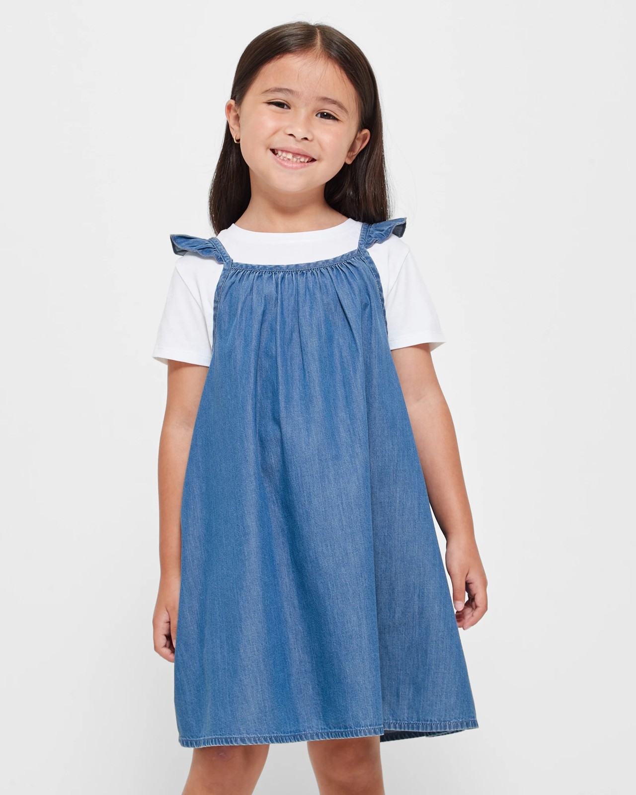 Indulge in summery style with our Chambray Two-Piece Dress Set - the perfect outfit for your little fashionista. Featuring a charming blue chambray dress enhanced with spaghetti straps and frill detailing, complemented by a white plain t-shirt for mix-and-match versatility. The dress boasts a gathered square neckline and a flattering A-line silhouette for a chic ensemble every time. Add a touch of charm to her wardrobe and watch her shine wherever she goes!