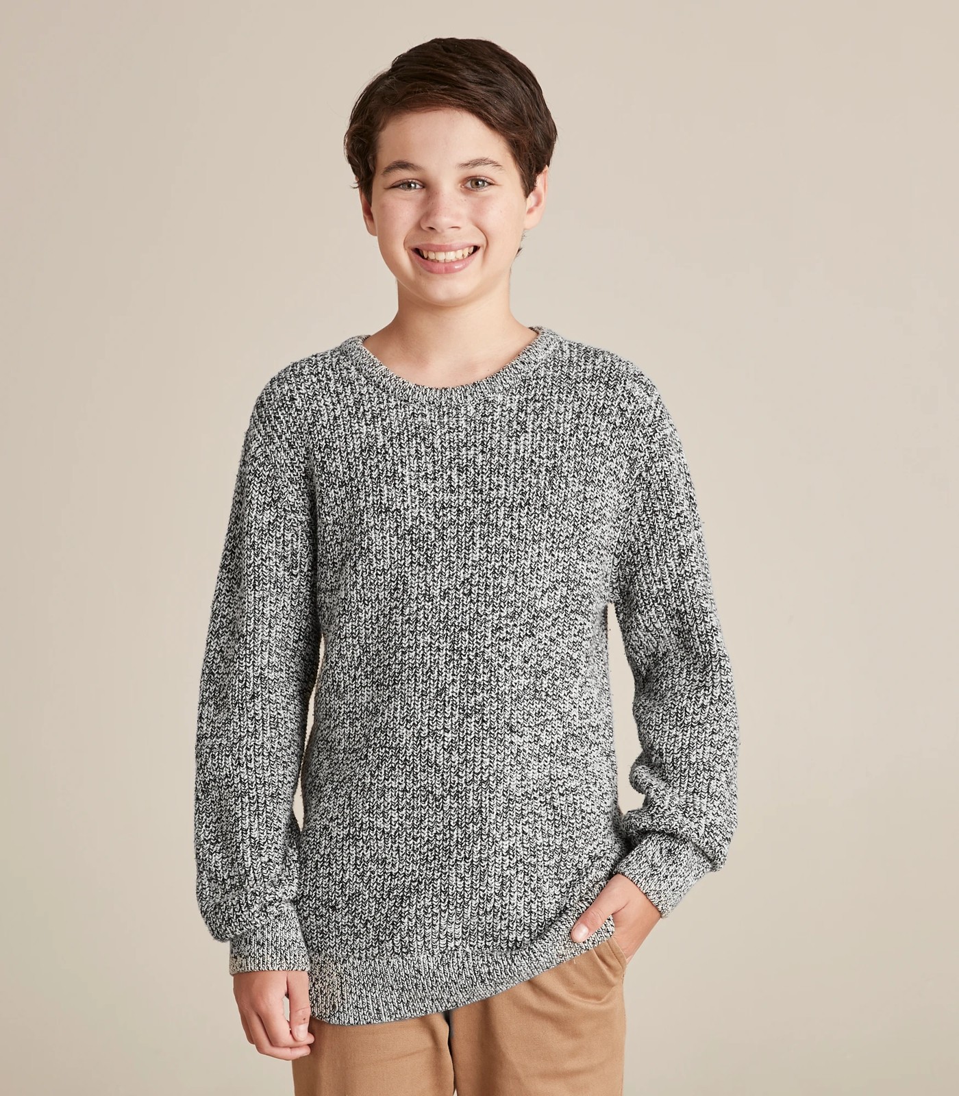 Crafted from a chunky but soft cotton acrylic blend knit in an all over neutral speckle comes the Chunky Knit Jumper, that's perfect addition to his winter wardrobe.
