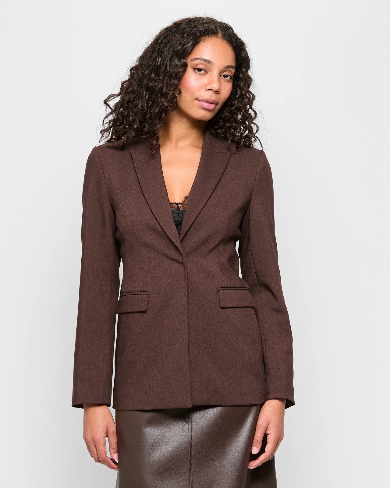 Introducing a blazer designed to complete your sophisticated look. Made from a blend of polyester and viscose, this piece offers a touch of stretch providing unmatched comfort. Featuring a fully lined interior and a tailored fit, which includes a round collared neckline and sleek front lapels. Its hidden front button closure and padded shoulders make it suitable for both professional and casual wear. The cinched design at the waist adds a touch of style, while the front fold-over top pockets and straight hemline add practical elements. Update your wardrobe with this essential item today.