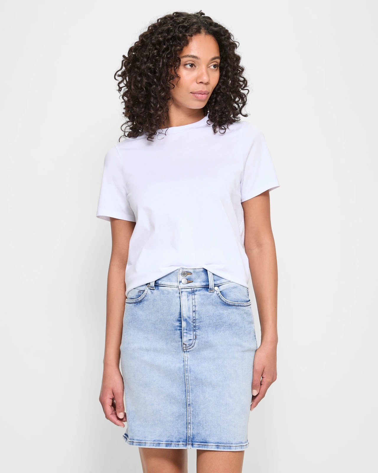 Experience the timeless charm of our Classic Denim Skirt - Shape Your Body. Crafted from a blend of premium cotton and polyester, the skirt offers a flattering fit with its Stretch for comfort feature. The Shape Your Body design enhances your silhouette, while the structured thick waistband and double front button and zip fastening ensure both style and functionality. Finished in a faded blue hue, complete with DENIM embossed buttons, the skirt boasts a classic straight cut and a short length perfect for any occasion. Let your confidence shine and shape your body effortlessly with our iconic denim skirt.