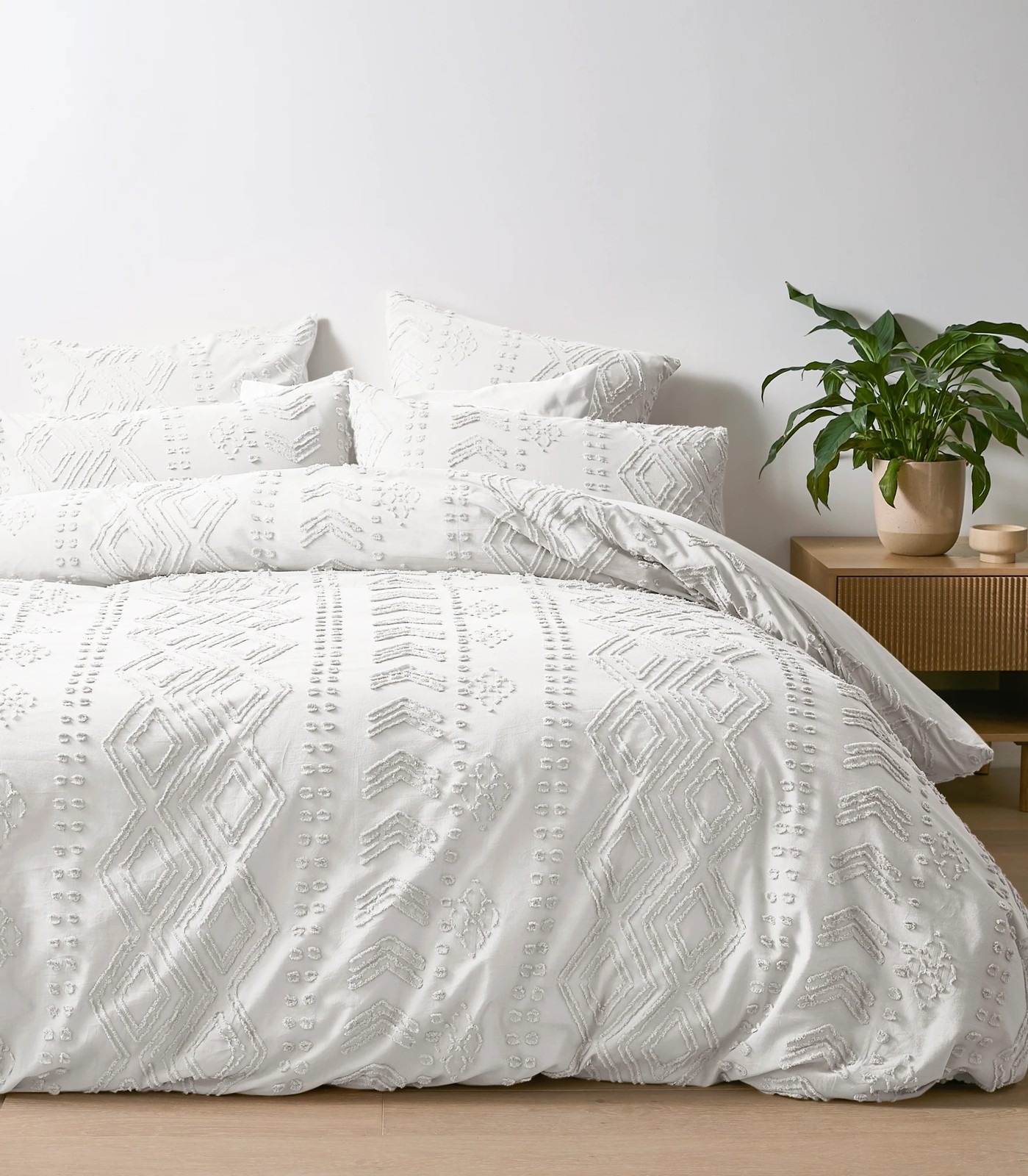 The easiest way to refresh your bedroom is with new bed linen and the Clemens Tufted Quilt Cover Set is a beautiful choice. In a crisp white colourway, this set includes a quilt and matching pillowcase/s with tufted jacuard front. The soft cotton fabric is machine washable and breathable for year-round comfort.