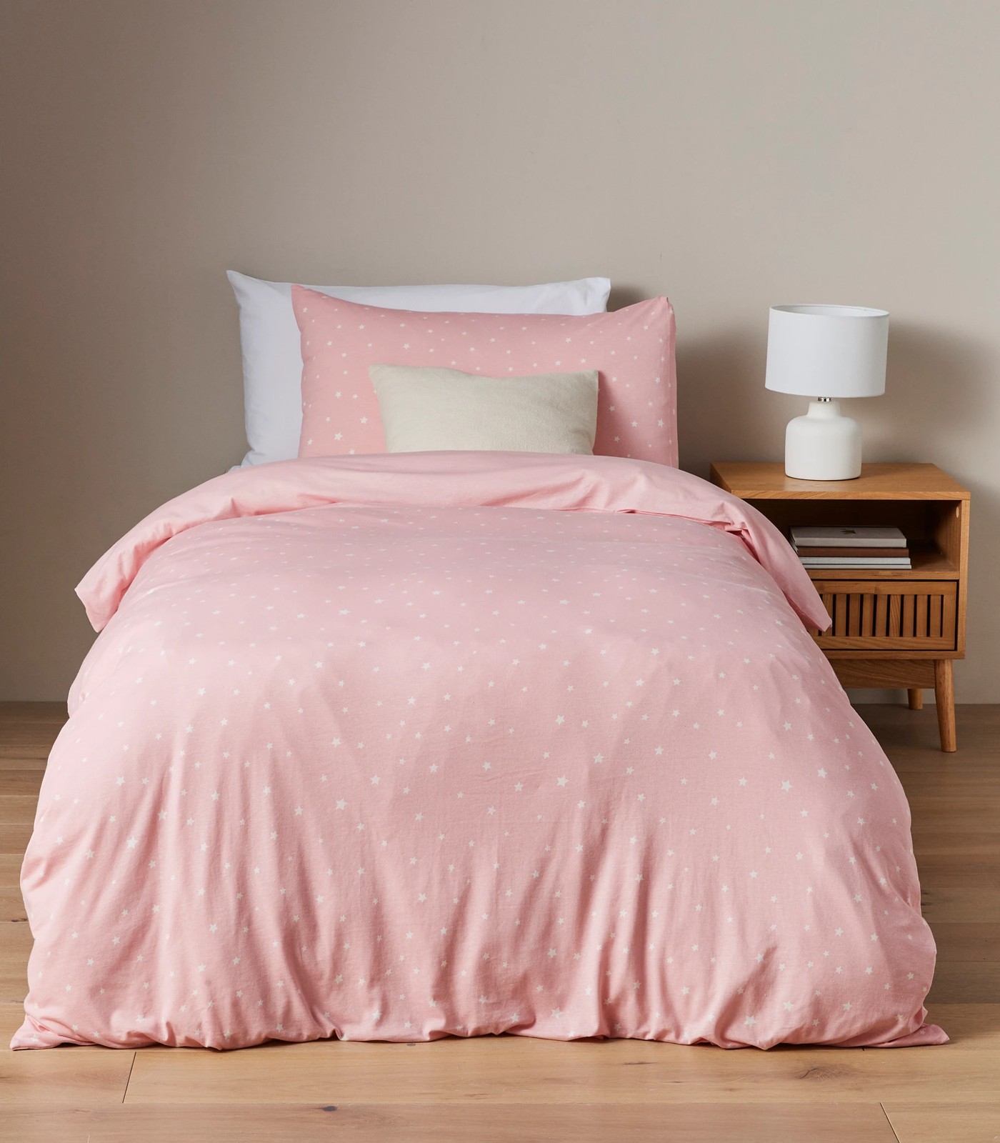 Soft to touch and gentle against skin, the Coda Stars Jersey Kids Quilt Cover Set feels broken in from day one. This quilt cover and pillowcase set is made from comfy cotton jersey and features a fun star print - perfect for kids bedrooms!