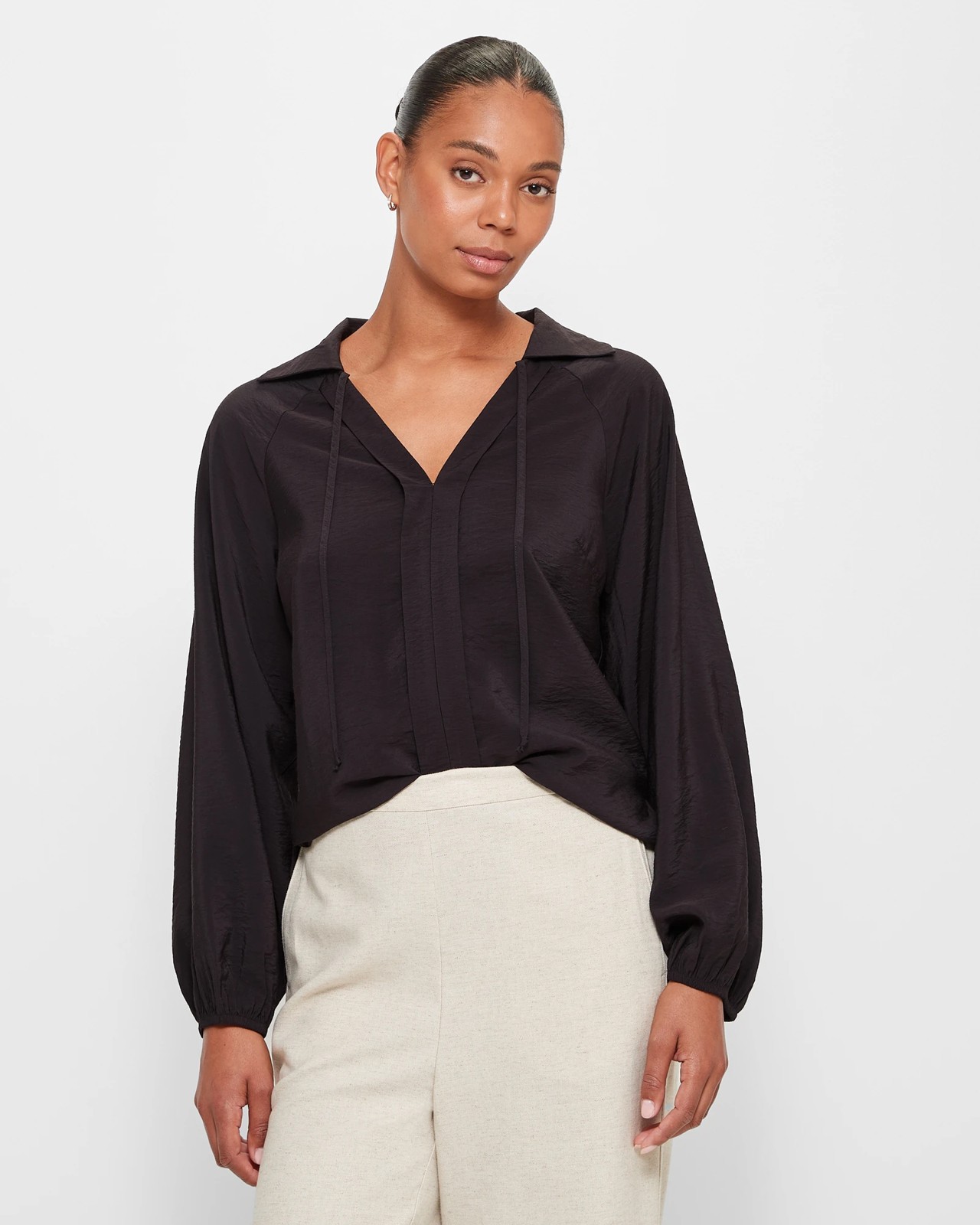 Introducing the Collared Tie Neck Blouse from Preview. Crafted from a lightweight blend of viscose and nylon, this blouse offers a regular fit for ultimate comfort. The round collared neckline adds a touch of sophistication, while the V-drop front with a top tie-up detail adds a hint of femininity. With fold-over trim down the v-neck drop and at the centre of the blouse, this piece is truly stylish. The long elastic cuff puff sleeves and darting at the chest elevate the look. Complete with a straight hemline and side seam splits, this blouse is perfect on its own or paired with the matching pants (sold separately) to create a chic set. Elevate your wardrobe with this must-have blouse today!