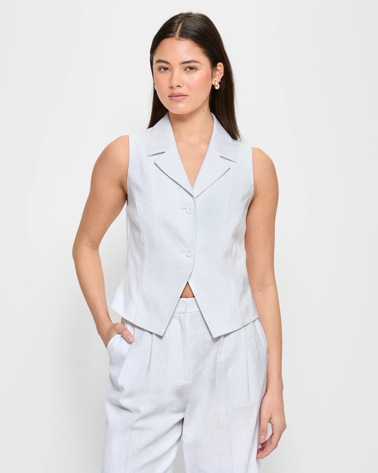 Discover the charm of the Collared Waistcoat by Lily Loves. Indulge in the luxurious feel of the ramie/cotton blend fabric, showcasing a textured outer appearance and a sleek slim fit. The round collared neckline with delicate front lapels adds a touch of elegance, while the button-through front design exudes sophistication. Experience the comfort of the inner lining and the structured panelling throughout. Perfect for any occasion, the waistcoat features a front pointed hemline and a straight back hemline for a polished look. Elevate your style effortlessly with Lily Loves.
