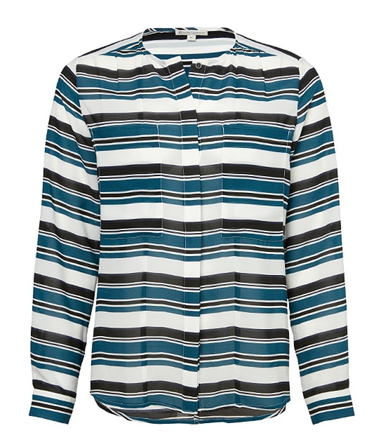 Keep your wardrobe on-trend with this collarless blouse. Made from a semi-sheer woven fabric, this long sleeve style features a concealed button front, large chest pockets and double button cuffs. Finished with a split back detail, style back with skinny leg bottoms.