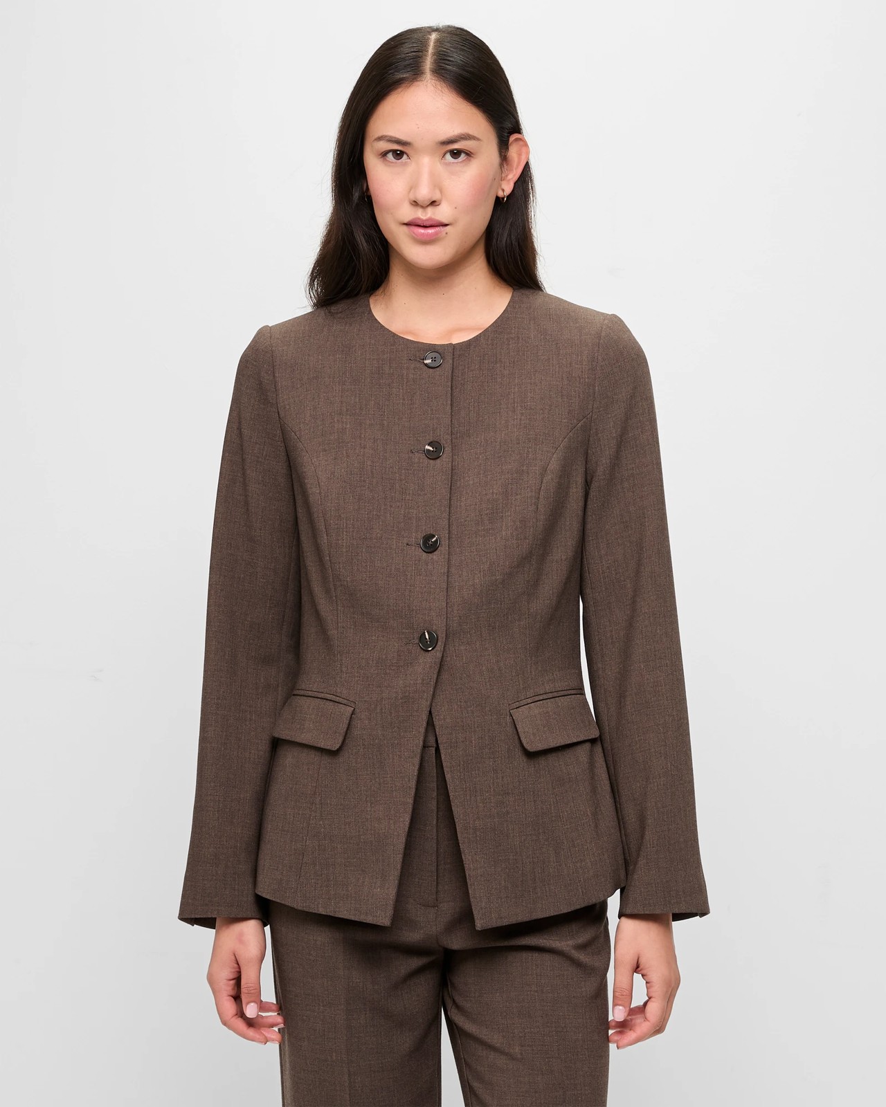 Step into sophistication with our Collarless Crew Blazer, blending modern style with timeless appeal. Made from high-quality polyester, this blazer features a chic round neckline, a sleek button-through front, and detailed panelling that enhances your figure. The coffee melange hue adds a touch of refined charm, ideal for both professional and casual settings. With its tailored fit and practical front fold-over pockets, this blazer seamlessly combines style with functionality. Whether you're heading to a meeting or out for an evening, make a statement and embrace classic charm. The model is wearing a size 10. Upgrade your wardrobe and captivate every room with this must-have piece.