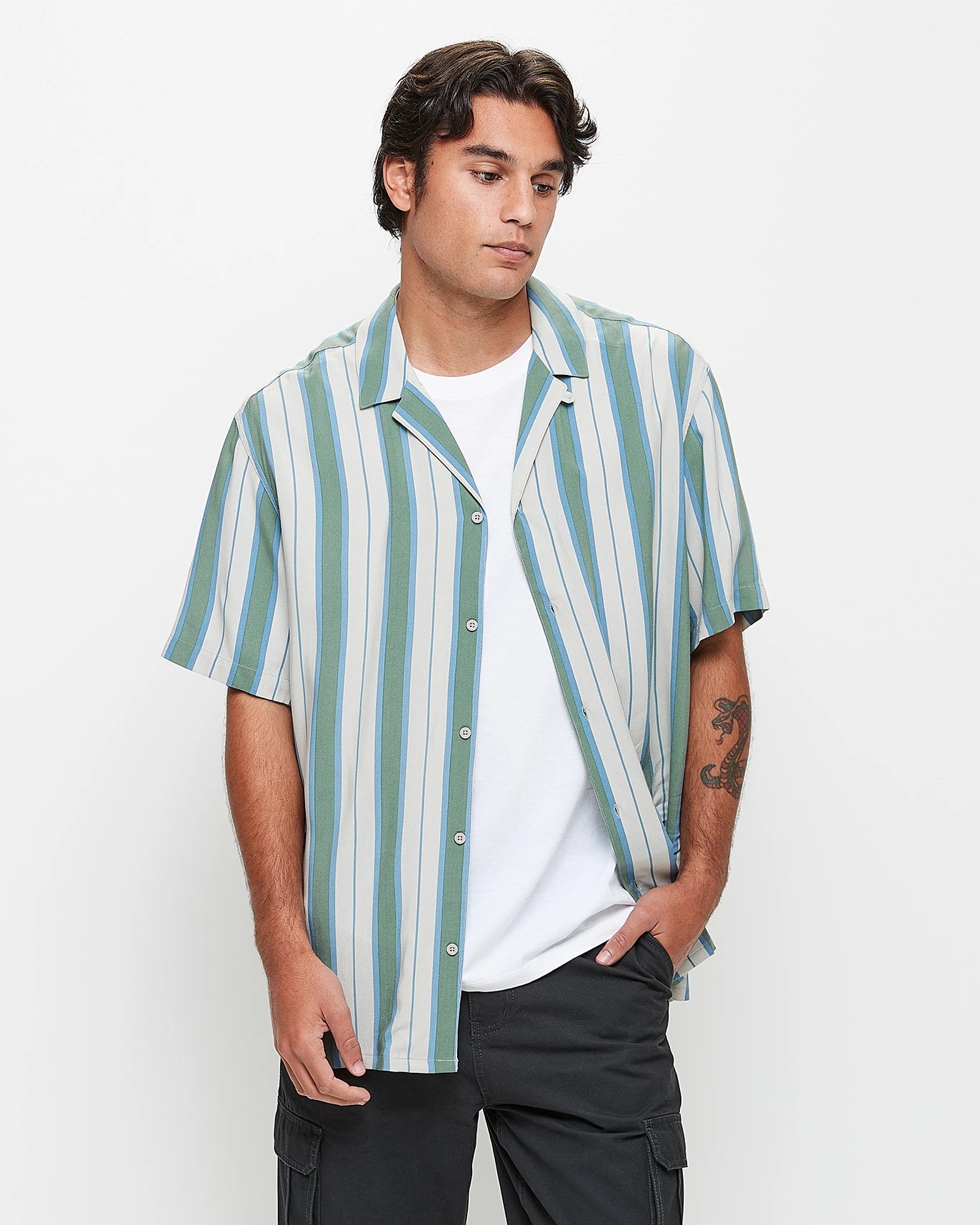 The Commons Vertical Stripe Short Sleeve Shirt is the perfect choice for your casual wardrobe. Crafted from a soft, lightweight viscose material, this shirt features a regular fit with a round collared neckline and button through front. The short sleeves and curved hemline provide an easy-to-style look that can be dressed up or down. With a neutral and green colour, this shirt will quickly become your go-to wardrobe staple.