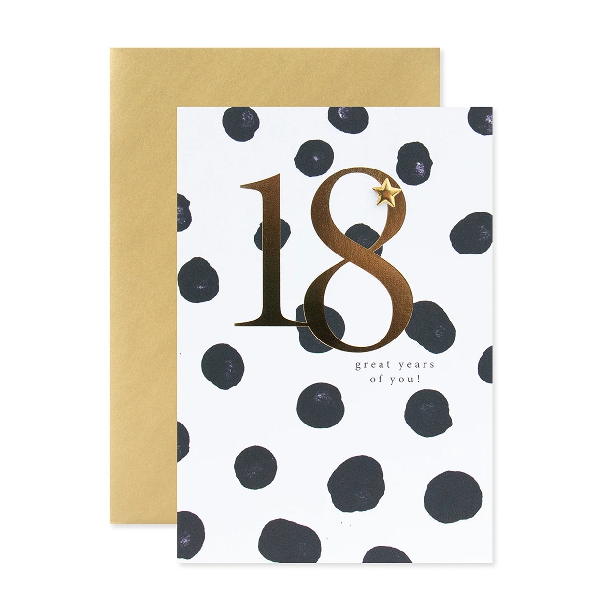 - Front of card features gold foil detailing, small gold star tip-on on a black spotted background with the message '18 great years of you!'