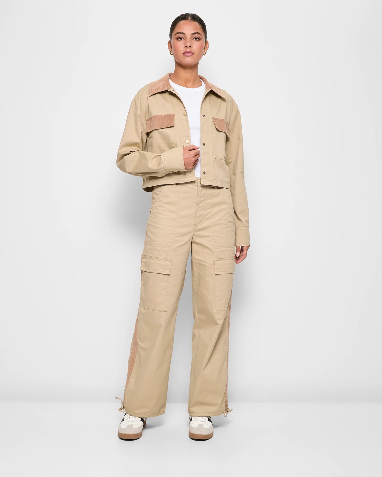 Step up your casual wear game with the Contrast Panel Cargo Trousers by Lily Loves. These trousers blend comfort and style effortlessly, made from a cotton-rich fabric with a touch of elastane for that perfect stretch. Imagine a day out or a casual get-together, where you're both comfortable and chic in these airy, regular-fit cargo trousers. The structured waistband and belt loops ensure a secure fit, while the snap button and zip fly closure make them easy to wear. Multiple pockets, including stylish fold-over top cargo pockets and large front pockets, add a practical flair. The contrasting cord panels and straight-cut legs with a drawstring hem bring a modern twist to a classic design. Get ready to turn heads - add them to your wardrobe today!