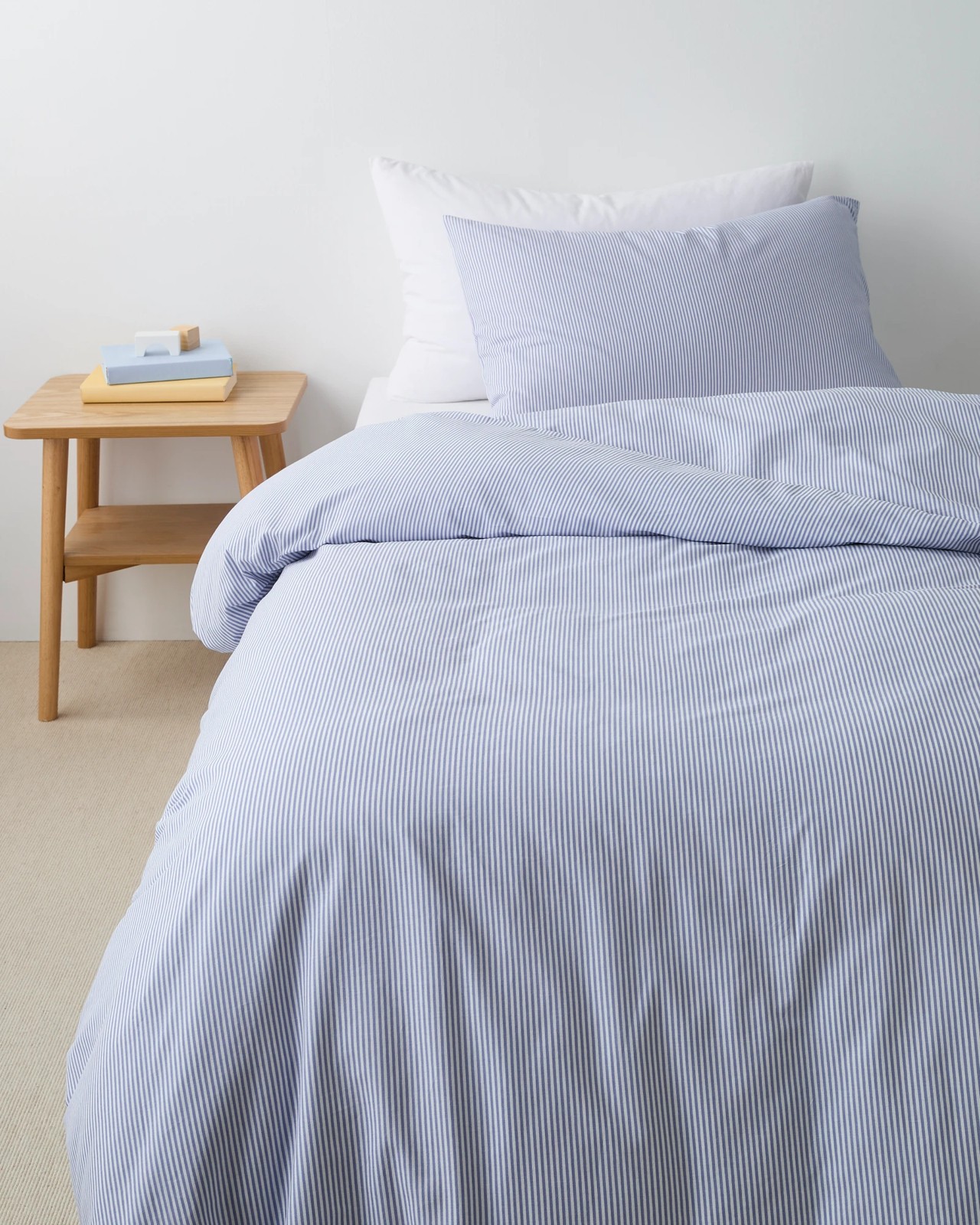 Create a tranquil atmosphere in your child's room with the Cooper Kids Quilt Cover Set. Made from soft Australian cotton, this set enhances comfort for a restful night's sleep. The blue stripe design adds a playful touch to the aesthetic. With a 180 thread count, it offers a soft and snug feel. Easy to care for, this quilt cover set is machine washable. Available in single, double, and queen sizes separately, each set includes the appropriate number of pillowcases and a quilt cover. Refresh your child's bedding with this charming set today!