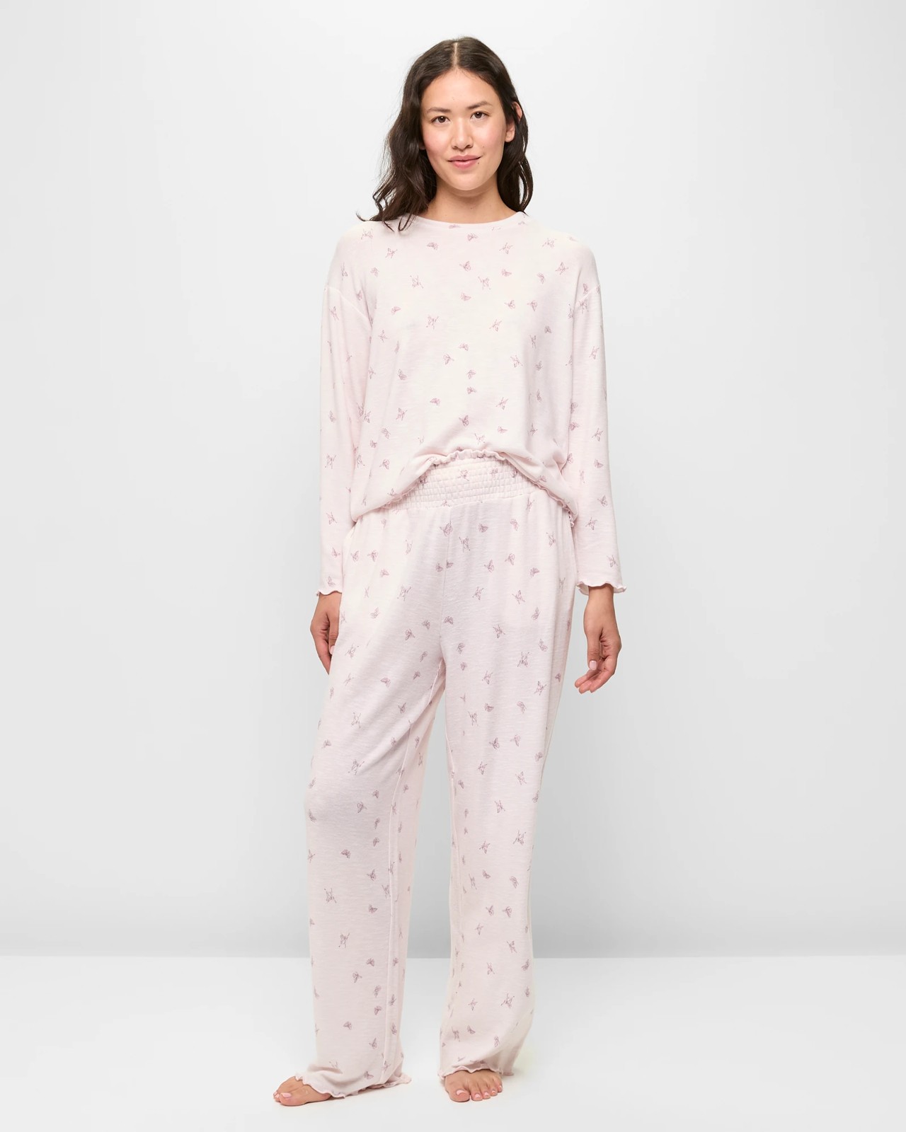 The Cosy Slub Knit Sleep Top is the perfect choice for a comfortable and peaceful night's sleep. Crafted from a luxurious blend of viscose and polyester, this sleep top offers stretch for ultimate comfort. Its soft and lightweight fabric feels gentle and soothing against the skin. Designed in a regular fit, it features an adorable print that add a touch of sweetness. The ribbed crew neckline and drop shoulder enhance the relaxed and cosy feel. Long sleeves with a lettuce hem provide a stylish twist, while the straight hemline ensures a flattering fit. Experience pure comfort and style with this sleep top.
