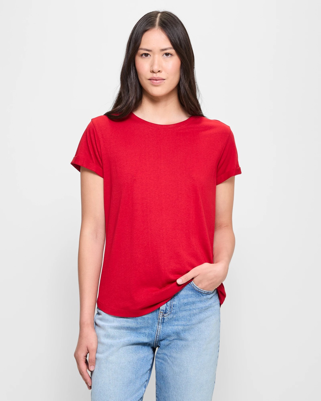 Discover ultimate comfort and style with our Cotton/Modal Relaxed Crew T-Shirt. Perfect for everyday wear, our t-shirt is made from cotton and modal fabrics to provide comfort. The relaxed fit and crew neckline offer a casual yet chic look, while the short sleeves and curved hemline add a trendy touch. Whether you're running daily chores or meeting friends for a coffee, our t-shirt is the perfect choice. Elevate your wardrobe with our versatile and fashionable t-shirt!