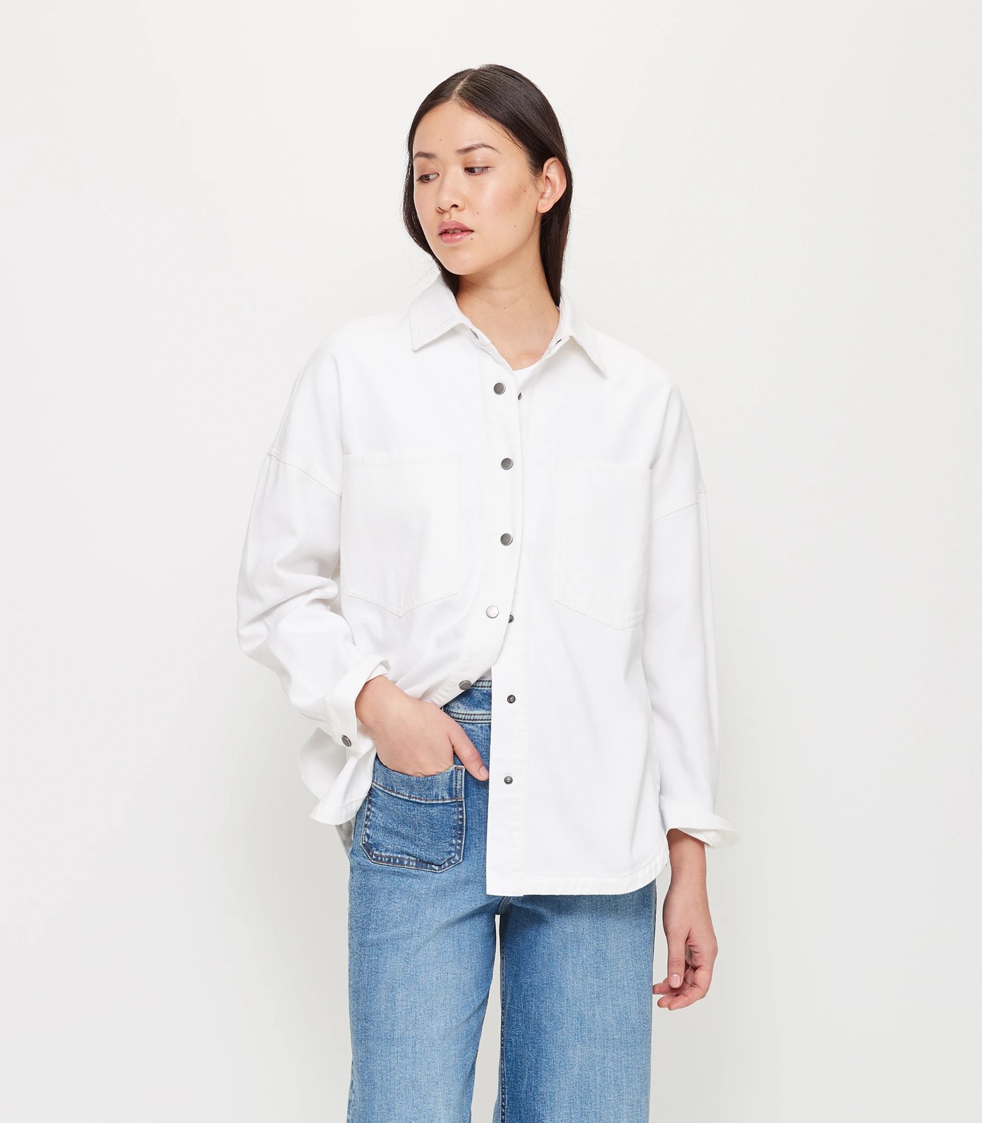 Cozy up in style with our newest cotton shacket. Crafted from acotton rich fabrication for ultimate comfort, this snap button front piece features a round collared neckline and drop shoulder. The long sleeves have a button snap closure and open chest pockets, while the curved hemline gives it a flattering fit. Available in brilliant white, it's sure to be your go-to piece this season!