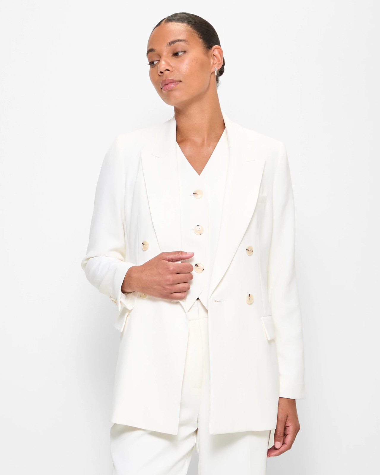 Experience timeless style with our Crepe Double Breasted Blazer. This impeccably tailored blazer features a round collared neckline with front lapels, creating a standout look. The padded shoulders and long button cuff sleeves add a touch of sophistication, while the inner lining ensures comfort. Its double-breasted design with secure button closures and practical front fold-over pockets make it ideal for any occasion. Complete your outfit by pairing it with the matching trousers, sold separately.