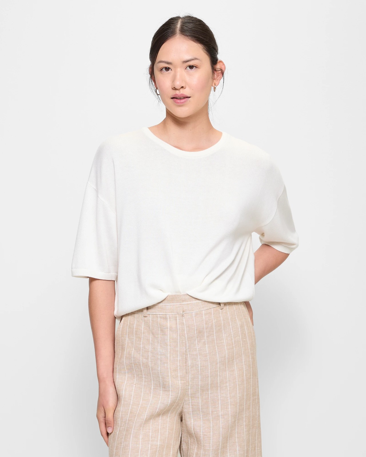 Experience the ultimate in comfort and style with our Crew Neck Fine Knit T-Shirt. This tee, made from a superior viscose and cotton blend, features a sophisticated knit design that's irresistibly soft against the skin. With its classic ribbed crew neckline, half-length sleeves, and ribbed cuffs, this shirt offers a regular fit, making it perfect for any occasion. The thick ribbed straight hemline adds an extra touch of finesse. Enhance your wardrobe and make this versatile piece yours today.