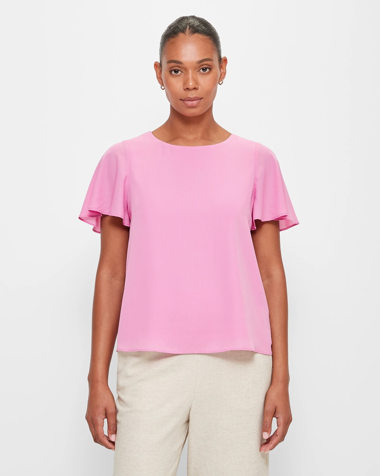 Introducing our stylish Ella Crew Neck Flutter Sleeve Blouse. This elegant blouse is perfect for any occasion, whether you're heading to the office or going out for a night on the town. Made from a high-quality polyester fabrication, this blouse is not only sleek and sophisticated, but it is also sustainably made with recycled materials. The blouse features a flattering crew neckline and short flutter sleeves, adding a touch of femininity to the overall look. It is fully lined for added comfort and has a curved hemline for a modern twist. This blouse is a must-have addition to your wardrobe. Upgrade your style and embrace the beauty of our Crew Neck Flutter Sleeve Blouse today!