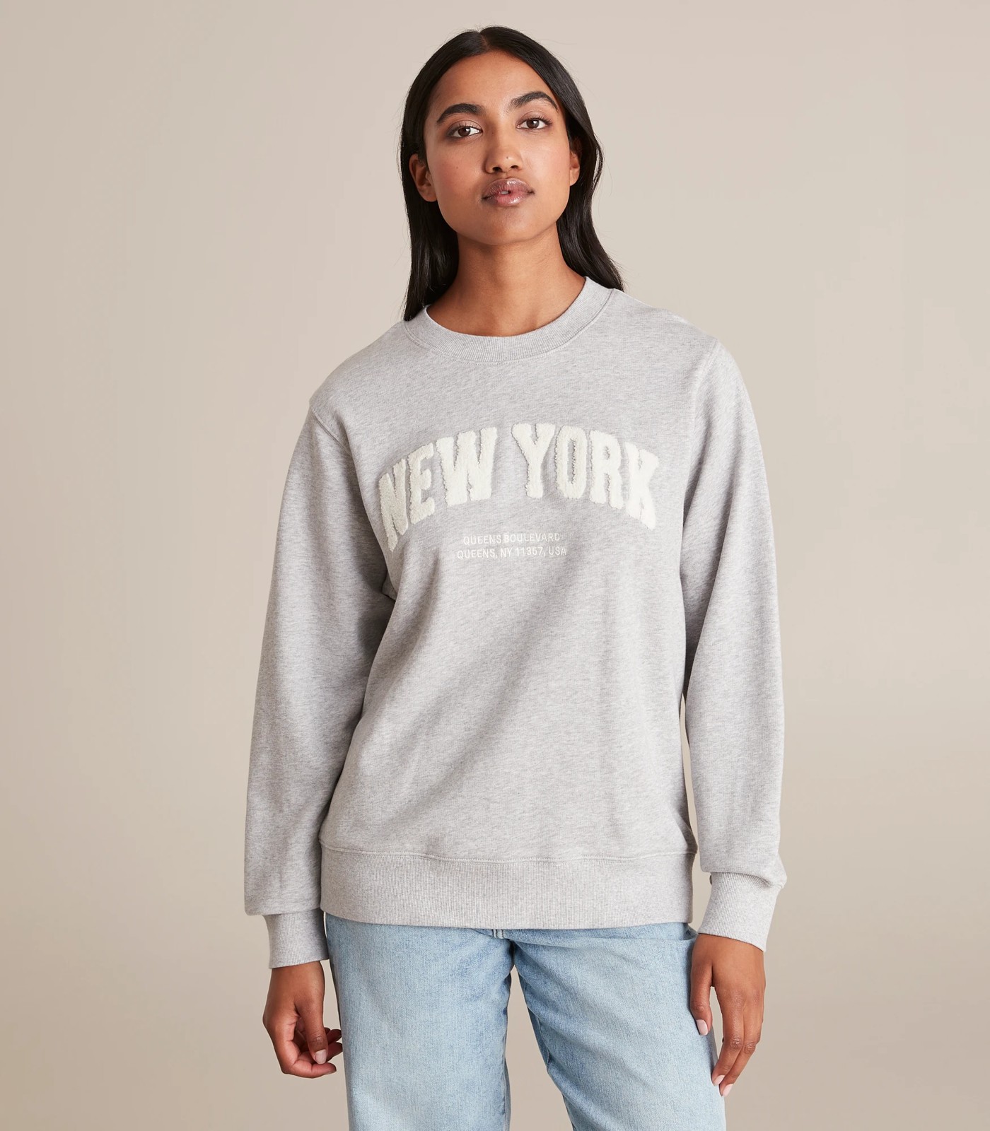 Bold chest print with wording NEW YORK QUEENS BOULEVARD QUEENS, NY 11357, USA