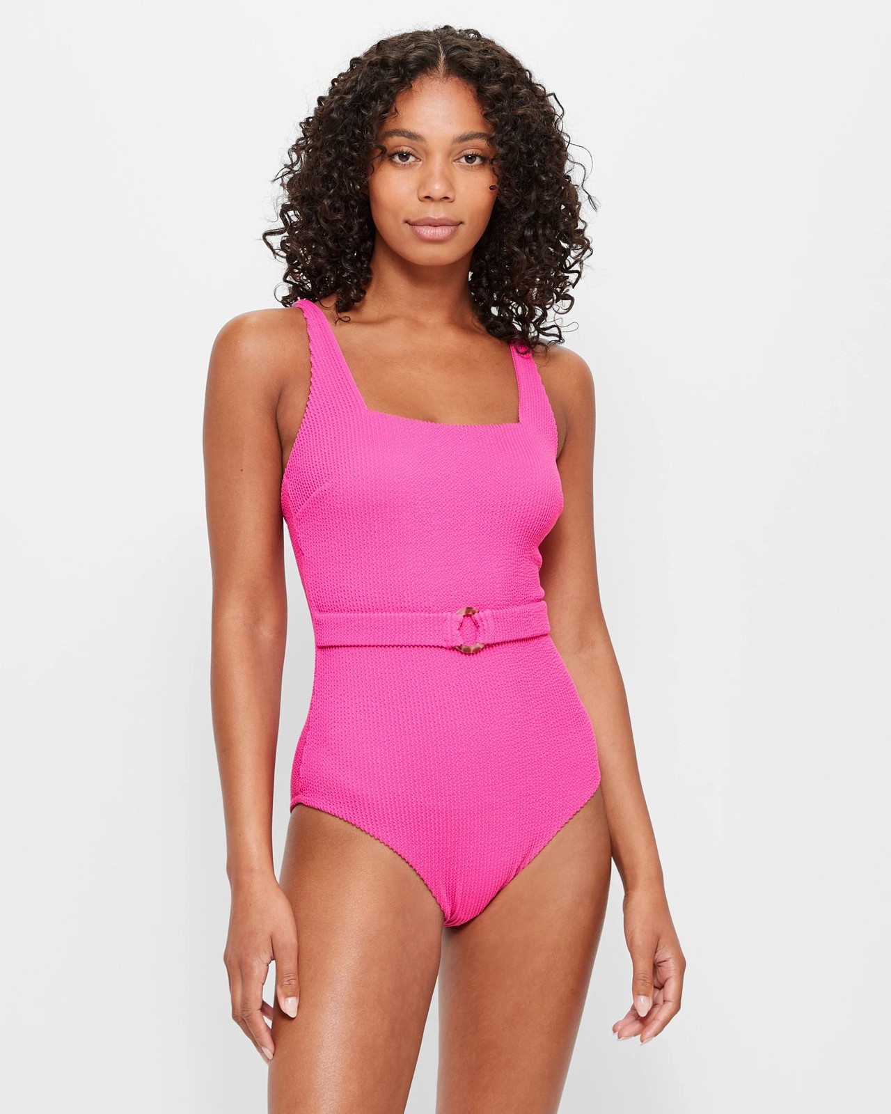 Make a splash this summer with our Crinkle One Piece Belted Swim Bathers. Crafted from a high-quality polyester blend, these swim bathers offer a comfortable stretch and are made with recycled materials. The all-over crinkle design adds a stylish touch, while the square neckline and adjustable shoulder straps provide a flattering fit. With a built-in crop top front for support and wirefree construction, you'll feel confident and comfortable all day long. The front attached buckle centre belt adds a trendy detail, and the high cut leg elongates your silhouette. Complete with full back coverage and a fully lined interior, these swim bathers are a must-have for your next beach adventure. Dive in and shop now!