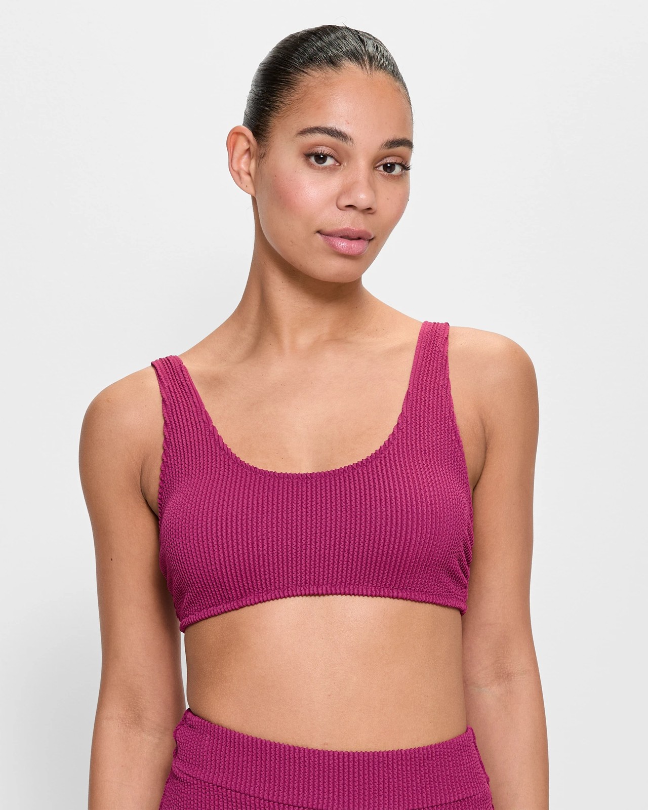 Indulge in ultimate relaxation with our Crinkle Scoop Swim Bikini Top. Dive into comfort and style as you enjoy its polyester-rich fabric, ensuring a perfect fit with a touch of stretch. Dive confidently into the pool knowing you're making a choice for the environment, as the top contains recycled materials. The wire-free design with removable padded cups offers both support and flexibility, while the scoop back adds a trendy flair. Complete your ensemble by pairing with the matching swim briefs (available separately) and make a splash!