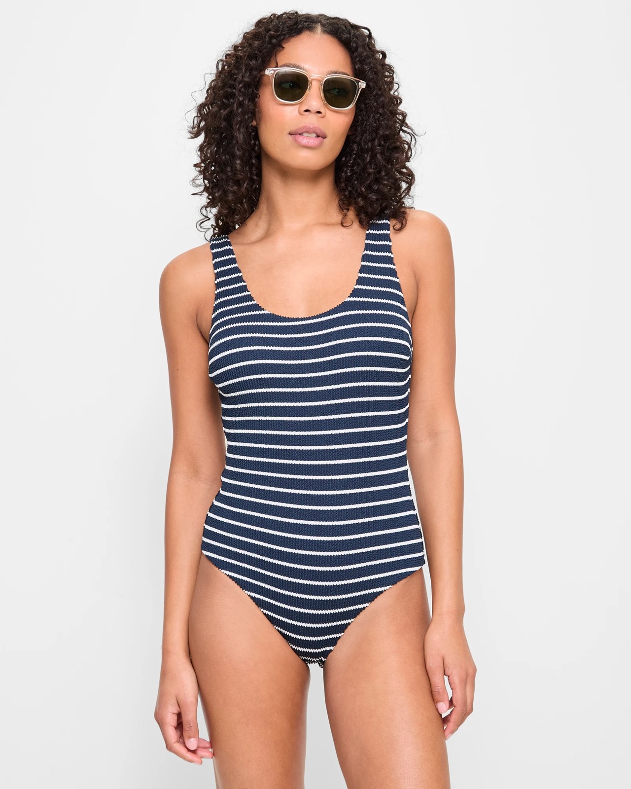 Picture yourself by the seaside or pool, enjoying the perfect mix of style and ease. Our Crinkle Stripe Scoop One Piece Swim Bathers are made from recycled materials, so you can feel great about your choice. The elegant stripe pattern offers a distinctive look while the crinkle texture enhances your silhouette. Featuring a supportive scoop neckline, thick shoulder straps, and high cut legs, this swimsuit provides complete back coverage and allows full movement. Dive into your next holiday with confidence and panache - make a splash today.