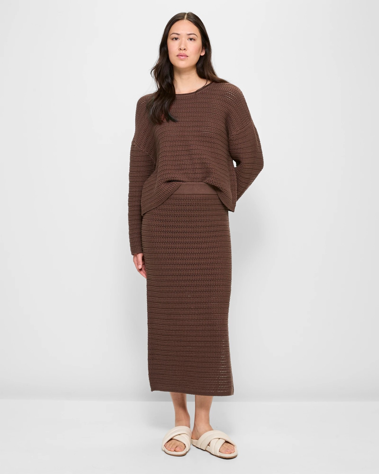 Indulge in elegance with our Crochet Midi Skirt, featuring a delicate cotton/acrylic blend in a charming tan brown colour. Crafted with intricate knit patterns throughout, offering a regular fit for comfort and style. A versatile pencil cut design with an elastic waistband ensures a perfect fit. The inside mini skirt adds modesty while the midi length and side seam splits exude sophistication. Elevate your wardrobe with a touch of chic crochet glamour today.