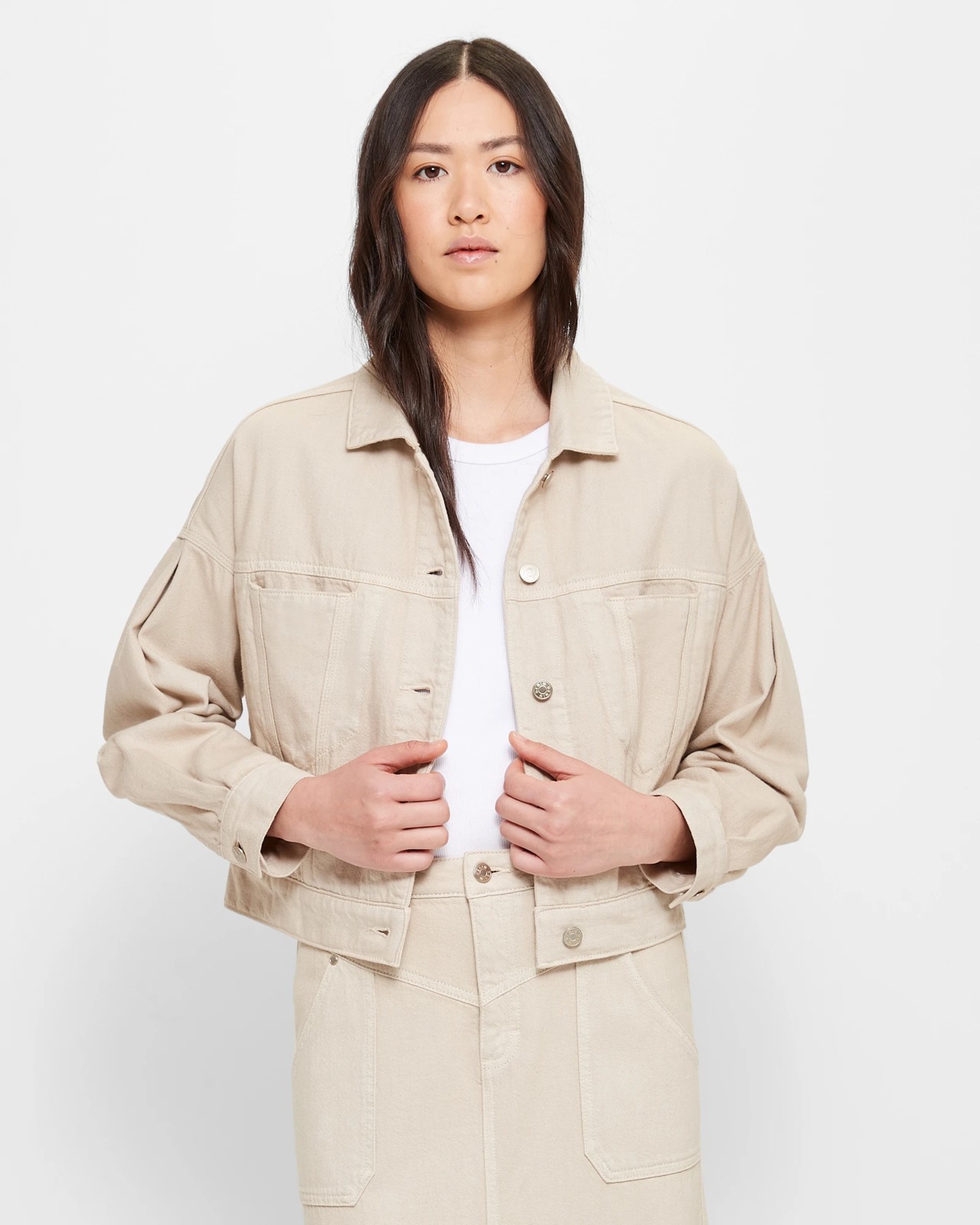 Introducing our Crop Trucker Denim Jacket, a must-have addition to your wardrobe. Made from a high-quality cotton fabrication, this jacket offers a comfortable fit that will elevate any outfit. The natural color adds a touch of casual elegance to the classic trucker design. With its round neckline and collar, button-through front, open chest pockets, and front pockets, this jacket combines style and functionality. The long sleeves with buttoned cuffs add a trendy yet timeless appeal. The front paneling creates a flattering silhouette, while the straight hemline and cropped length give it a contemporary twist. Complete with back button flaps on the hemline, this jacket offers versatility and convenience. Whether you're heading to work or a casual outing, our Crop Trucker Denim Jacket is sure to turn heads. Don't miss out - elevate your style today and make a statement with this one-of-a-kind jacket!