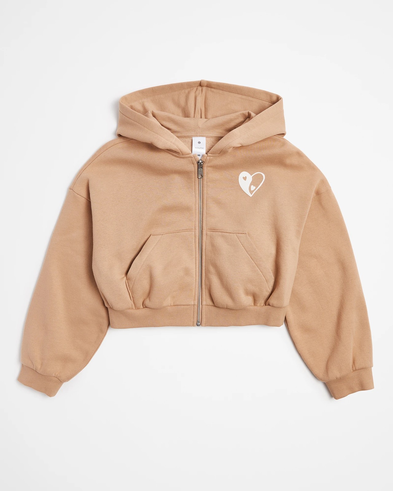 Introducing our trendy Cropped Print Zipped Hoodie, perfect for fashion-forward girls. Made from a comfortable and soft cotton-rich fabric, this hoodie features a cropped fit for a stylish look. The tan colour adds a touch of warmth to any outfit. It comes with a hood and a zip front for easy wear and convenience. The long sleeves feature ribbed cuffs for a snug fit, and the straight ribbed hem adds a modern touch. The highlight of this hoodie is the large print on the back, making it a true fashion statement. Stay cosy with its fleece lining. Upgrade your wardrobe today with this must-have hoodie!