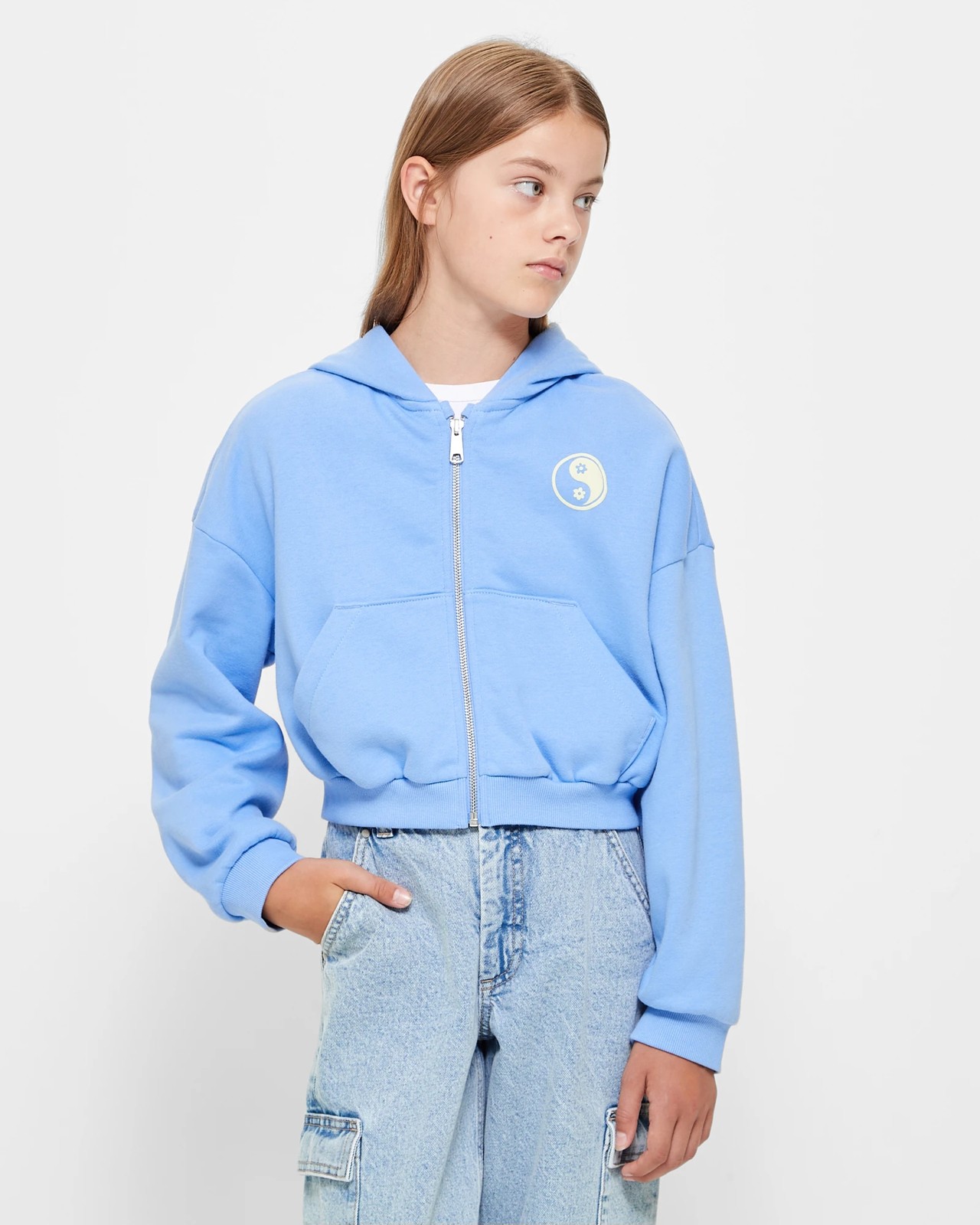 Introducing our trendy Cropped Print Zipped Hoodie, perfect for fashion-forward girls. Made from a comfortable and soft cotton-rich fabric, this hoodie features a cropped fit for a stylish look. The tan colour adds a touch of warmth to any outfit. It comes with a hood and a zip front for easy wear and convenience. The long sleeves feature ribbed cuffs for a snug fit, and the straight ribbed hem adds a modern touch. The highlight of this hoodie is the large print on the back, making it a true fashion statement. Stay cosy with its fleece lining. Upgrade your wardrobe today with this must-have hoodie!