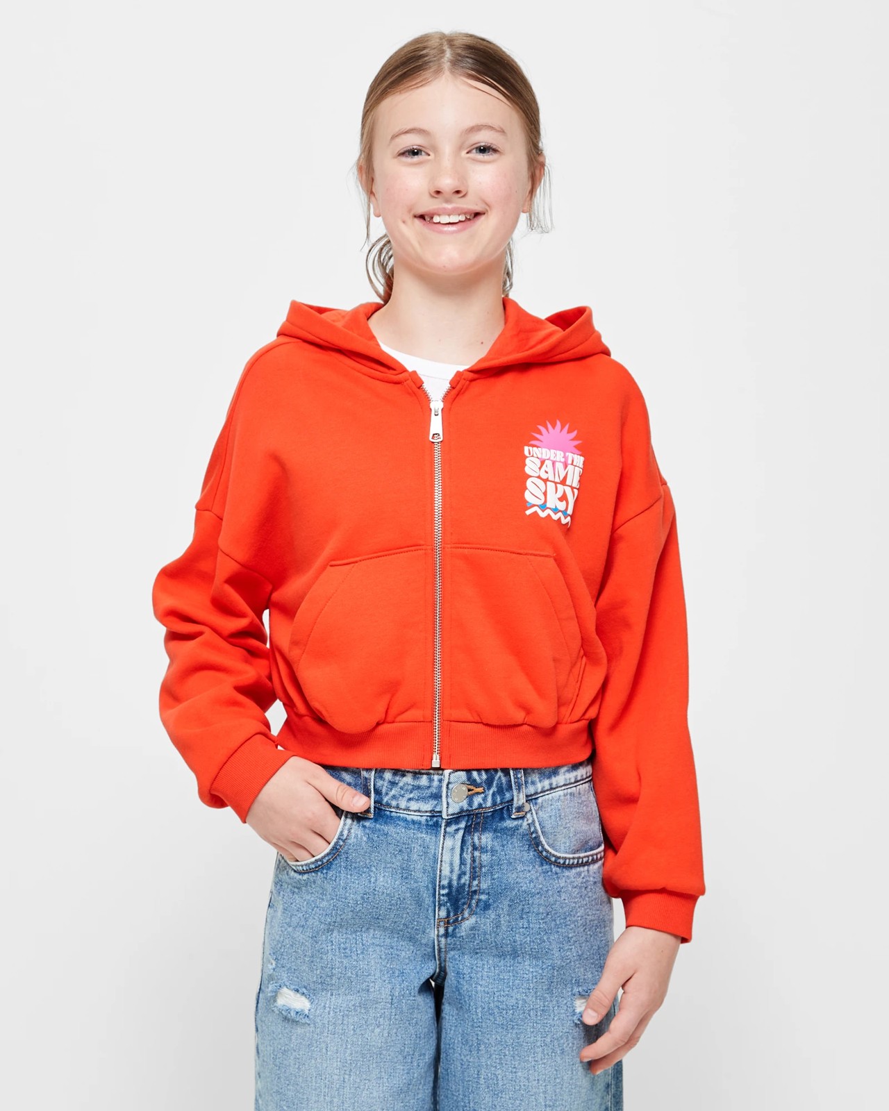 Introducing our trendy Cropped Print Zipped Hoodie, perfect for fashion-forward girls. Made from a comfortable and soft cotton-rich fabric, this hoodie features a cropped fit for a stylish look. The tan colour adds a touch of warmth to any outfit. It comes with a hood and a zip front for easy wear and convenience. The long sleeves feature ribbed cuffs for a snug fit, and the straight ribbed hem adds a modern touch. The highlight of this hoodie is the large print on the back, making it a true fashion statement. Stay cosy with its fleece lining. Upgrade your wardrobe today with this must-have hoodie!