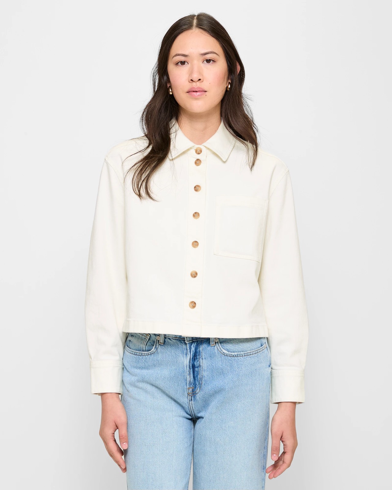 Experience ultimate style versatility with our Cropped Shacket. Tailored from a blend of soft cotton and polyester, offering both comfort and stretch. The regular fit, button-through design and chic cropped length make a fashion statement for any occasion. Whether worn as a classic shirt or trendy cover-up, the round collared neckline and side seam splits add a touch of sophistication. Elevate your wardrobe with the perfect balance of casual and trendy with every wear.