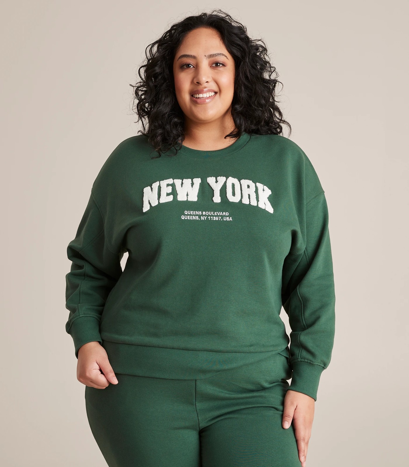 • Long ribbed cuff sleeves Bold chest print NEW YORK QUEENS BOULEVARD QUEENS NY 11357 USA