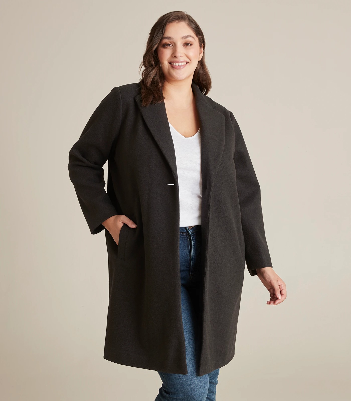 A great coverup for the winter months, the Curve longline coat has an all over woolen look, single button front closure, longline design and long sleeves for coverage.