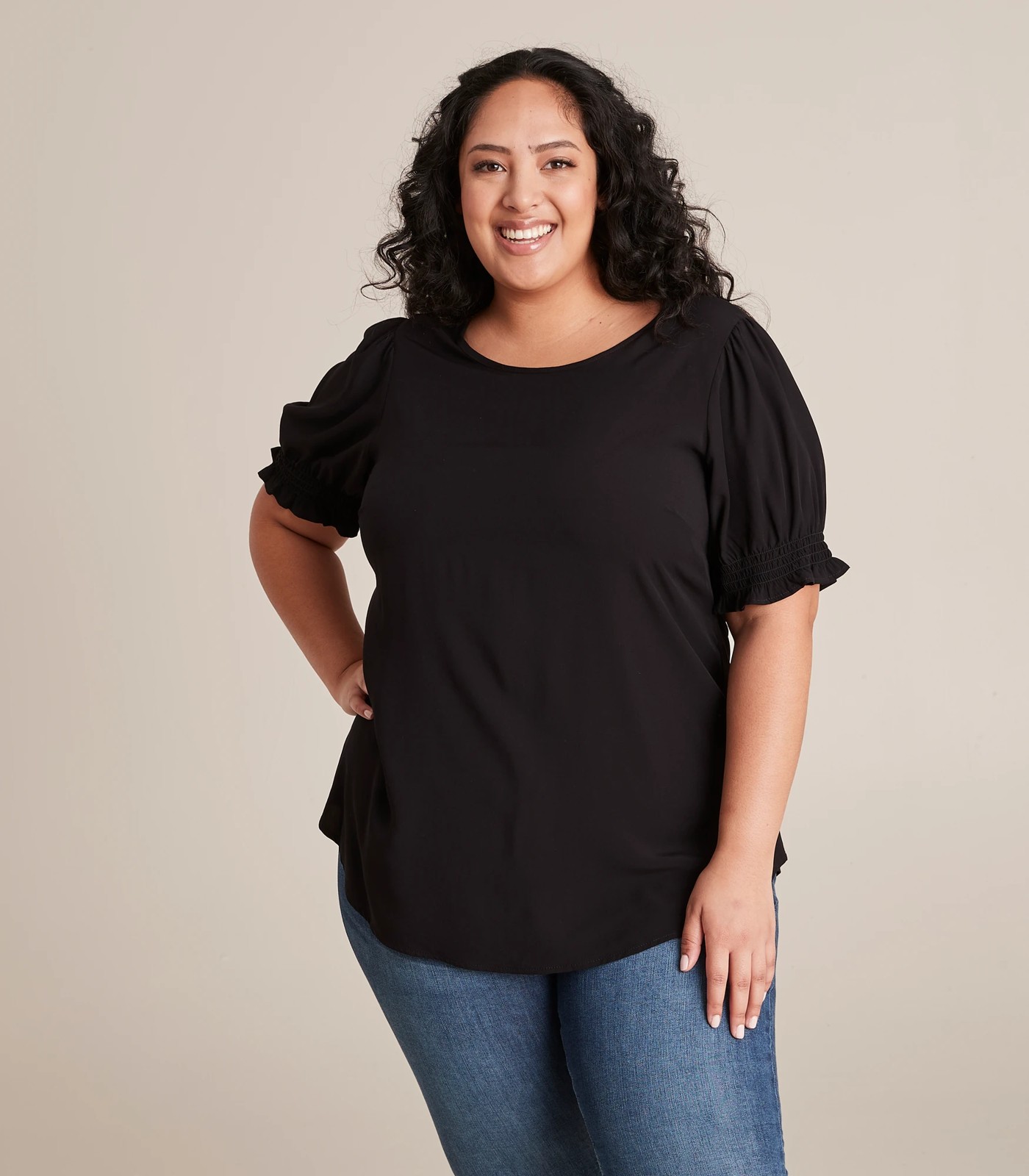 A great everyday top with a wearable appeal, the Curve scoop neck woven t-shirt features a scoop neckline, short shirred cuff sleeves a longline design and a curved hemline to flatter your shape.