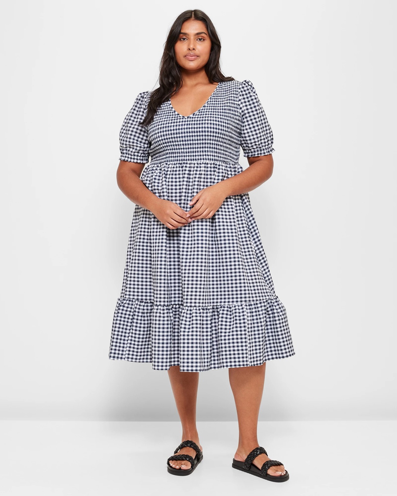 A cute dress for wearing all through the summer season, the Curve shirred bust dress has a v-neckline with short puff sleeves and a thick shirred bodice for easy pull on, an all over gingham fabric and a midi length.
