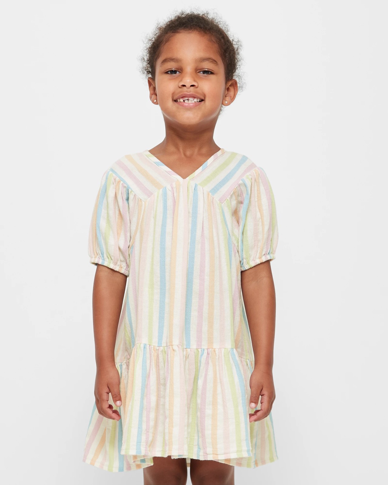 Upgrade her summer wardrobe with this stylish Cut Out Back Striped Dress. Made from a comfortable and lightweight cotton fabric, this dress offers a regular fit for a relaxed look. The multi-coloured stripe design adds a playful touch, while the V-neck and short raglan puff sleeves with elastic cuffs provide a trendy look. The tiered hem adds volume and movement, making this dress perfect for any occasion. Finished with a keyhole button at the centre back neck and a cut-out back detail, this dress is sure to turn heads wherever she goes. Don't miss out on this must-have dress!